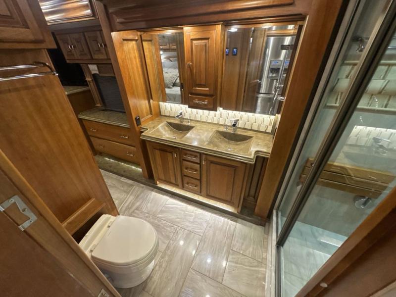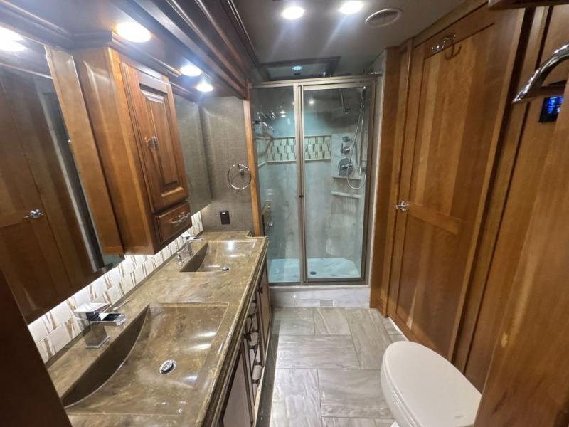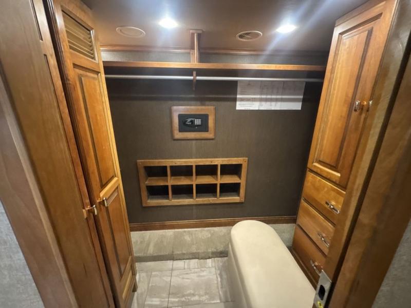 The bathroom is centrally located and offers entry from the living area, or from inside the master bedroom. Enjoy a spacious shower, toilet, and a vanity with dual sinks along with overhead cabinets that are part of the bedroom/bath slide out. This slide continues toward the rear of the unit and features storage with drawers, plus more overhead cabinetry, and a bedroom TV too.