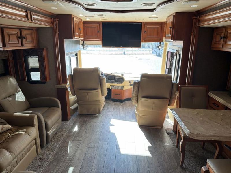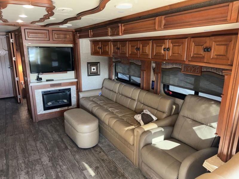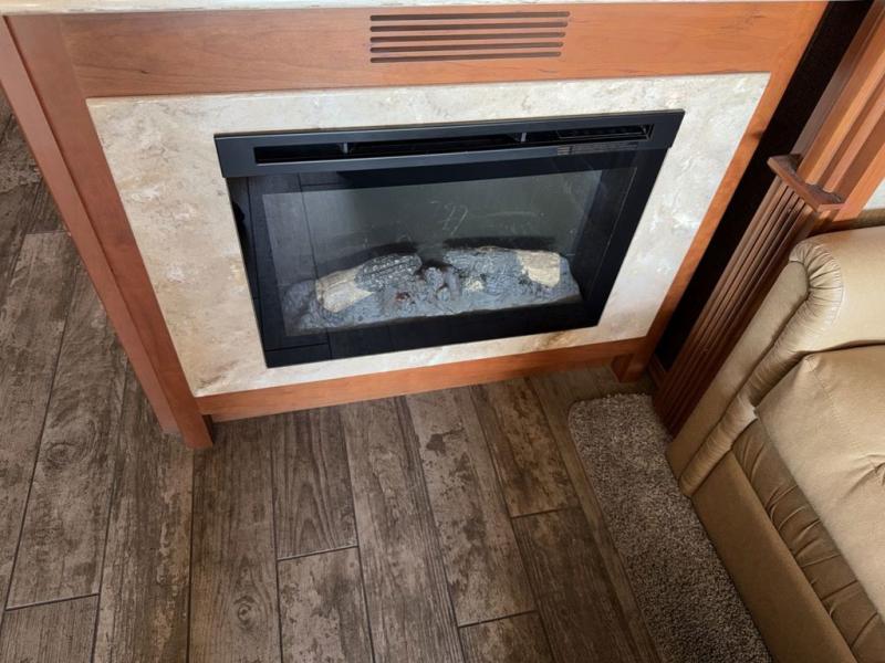 Along the road side there is a slide out sofa bed with ottoman, plus a recliner behind the driver's seat. There is also overhead storage to help keep things neat and organized. A TV and fireplace can be found along the interior wall.