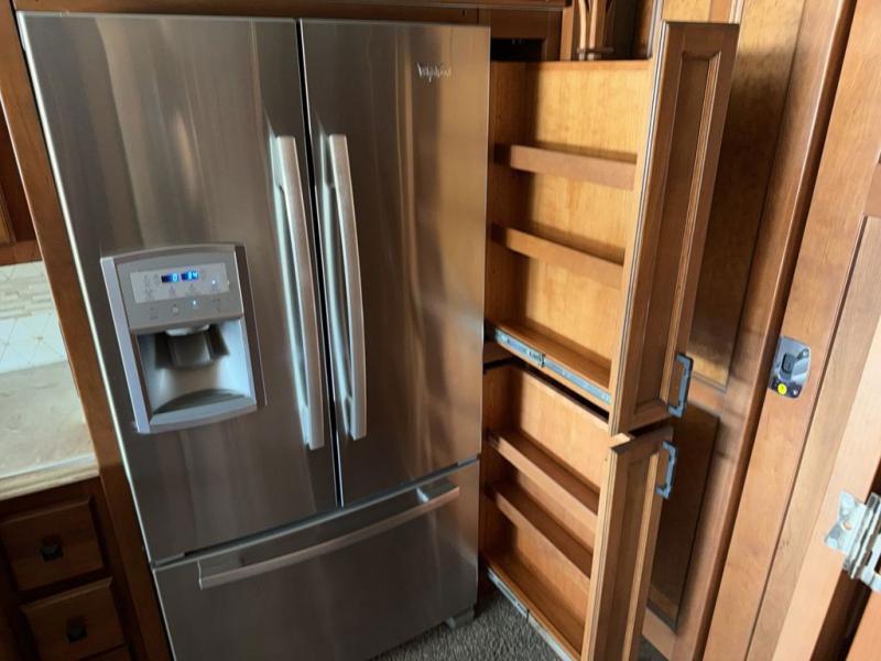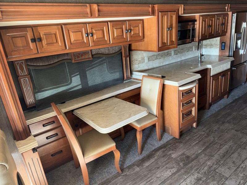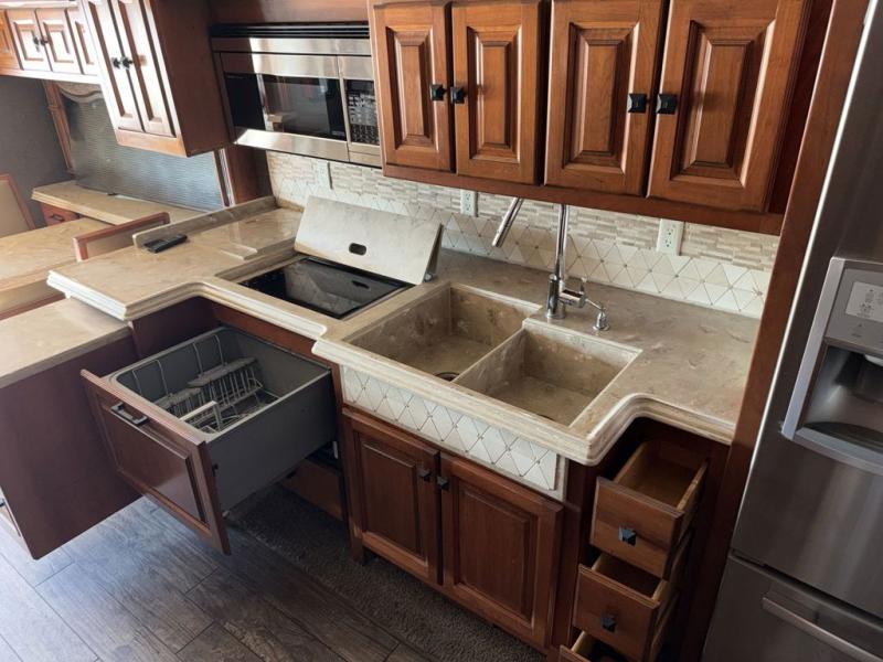 On the inside enjoy dual opposing slide outs in the main kitchen and living space, as well as in the master bedroom and bath area. Just behind the driver and passenger chair you find a dinette with computer work station on the left, plus the kitchen area to follow. Here you will enjoy counter space, a stove-top and range with overhead microwave oven, plus an optional drawer type dishwasher for added convenience. There is also a double sink, a residential refrigerator, pantry, plus ample overhead storage for dishes.
