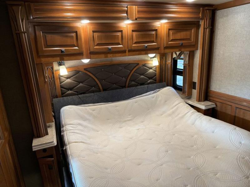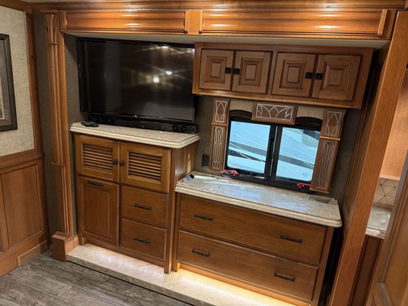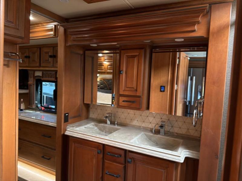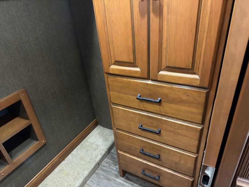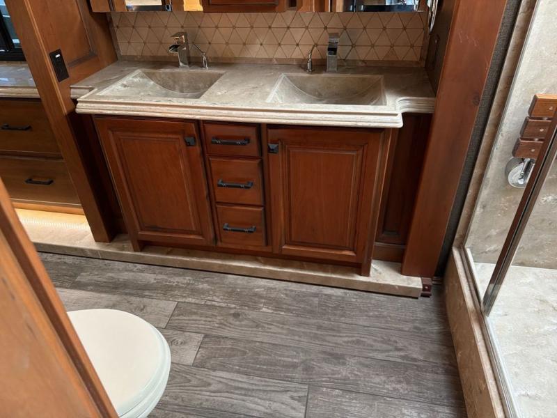 The bathroom is centrally located and offers entry from the living area, or from inside the master bedroom. Enjoy a spacious shower, toilet, and a vanity with dual sinks along with overhead cabinets that are part of the bedroom/bath slide out. This slide continues toward the rear of the unit and features storage with drawers, plus more overhead cabinetry, and a bedroom TV too.