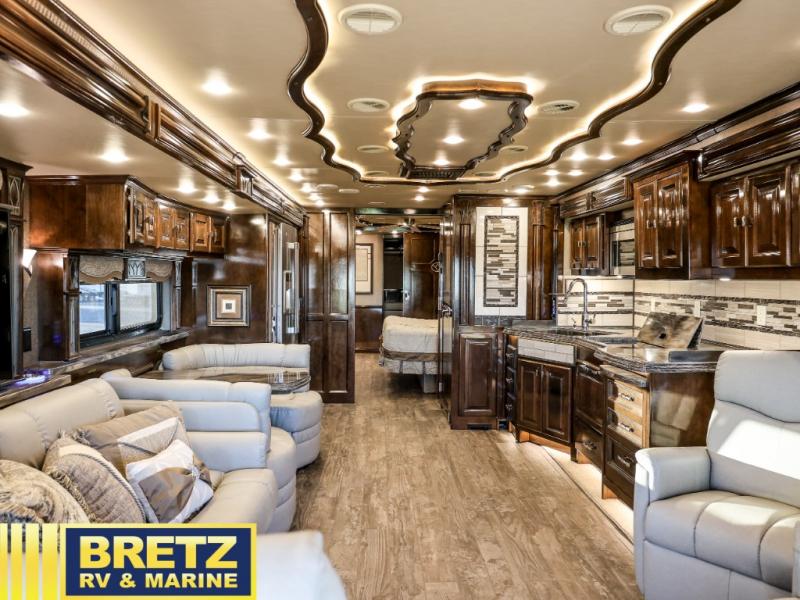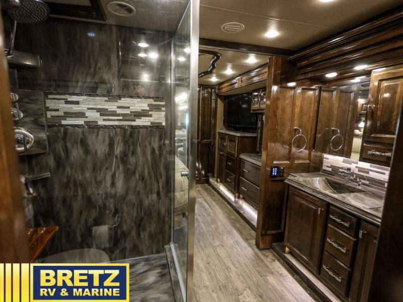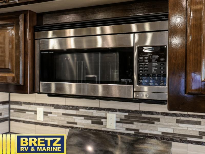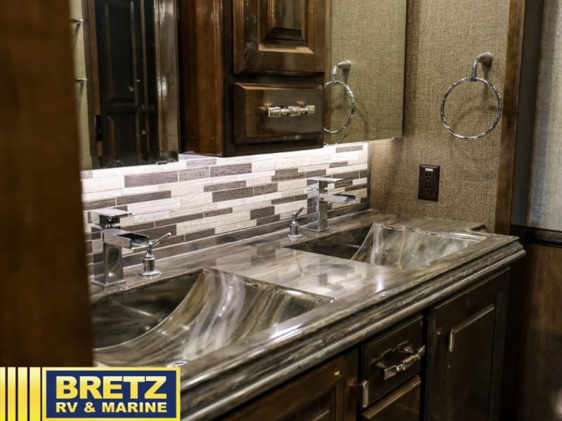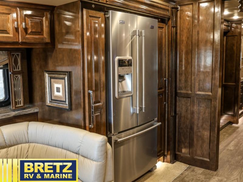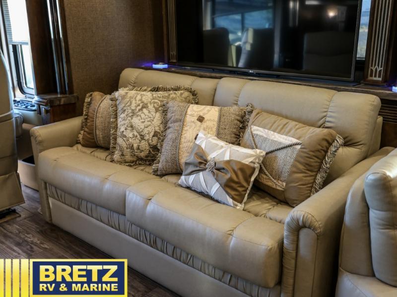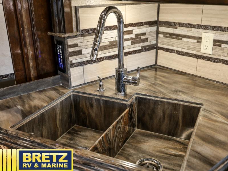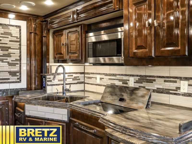 As you enter the motor home, in the front cab there is an overhead TV for your viewing pleasure. The kitchen and living areas are open and spacious with dual opposing slide outs. Along the door side the slide out has a sofa with lift TV, a dinette with computer workstation, two pantries, and a residential refrigerator. The slide out on the opposite side of the motor home features a sofa bed, overhead cabinets, a pull out counter, two burner range, a microwave, and a double kitchen sink. You can even choose to have an optional drawer type dishwasher.