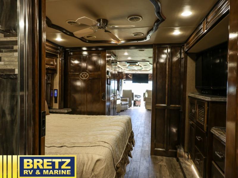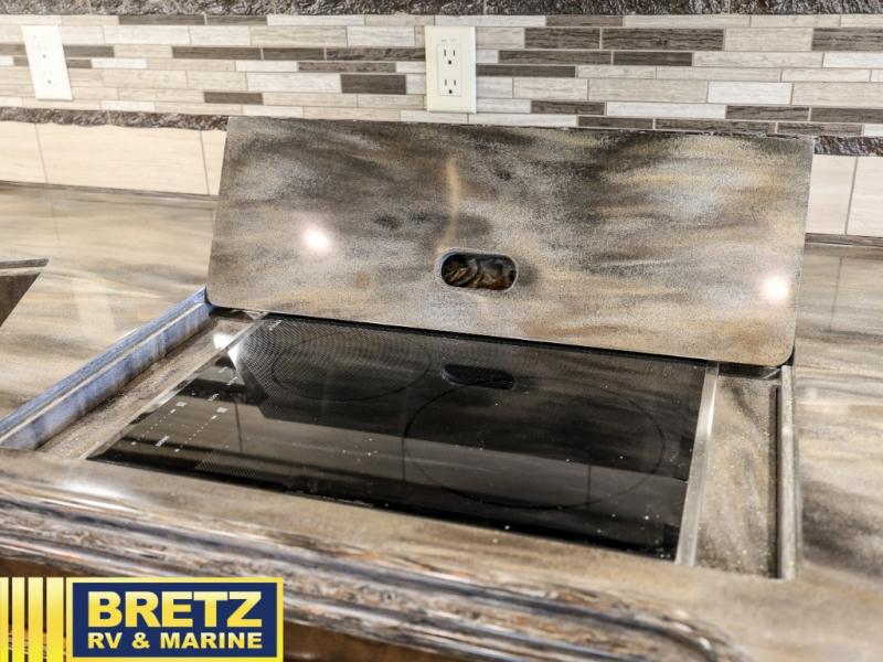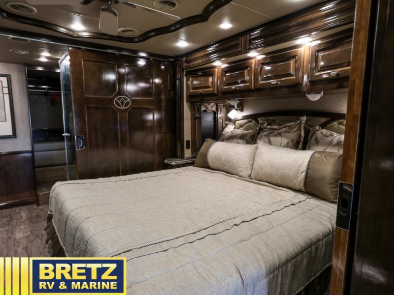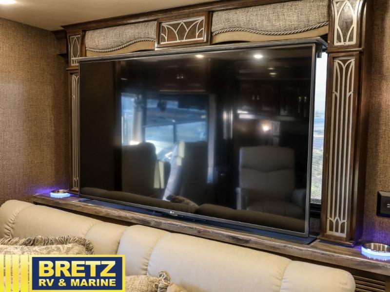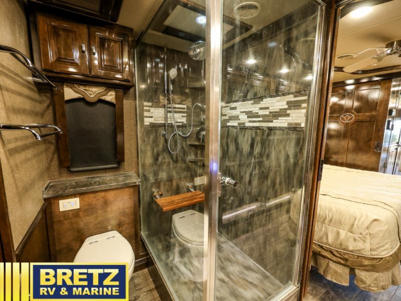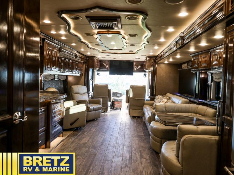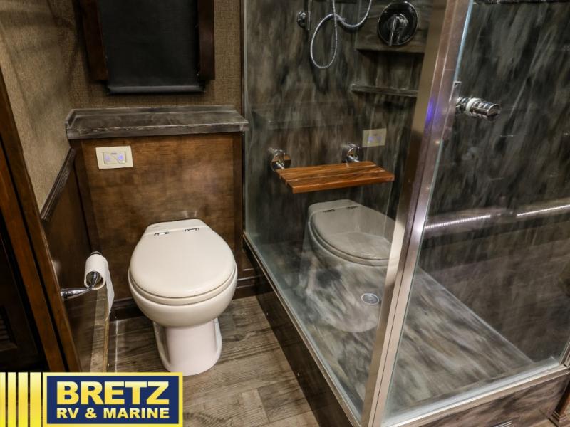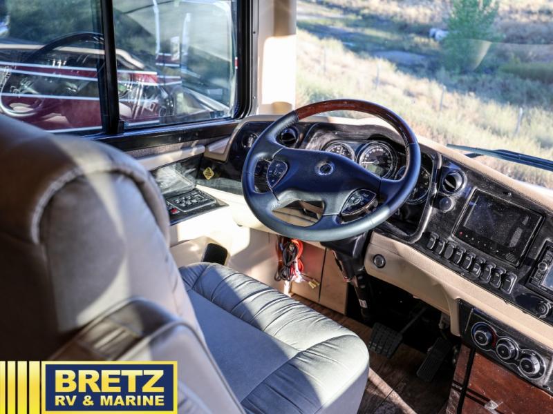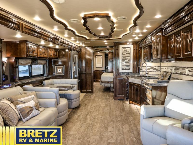 As you enter the motor home, in the front cab there is an overhead TV for your viewing pleasure. The kitchen and living areas are open and spacious with dual opposing slide outs. Along the door side the slide out has a sofa with lift TV, a dinette with computer workstation, two pantries, and a residential refrigerator. The slide out on the opposite side of the motor home features a sofa bed, overhead cabinets, a pull out counter, two burner range, a microwave, and a double kitchen sink. You can even choose to have an optional drawer type dishwasher.