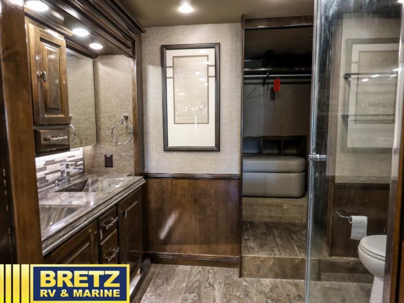 The bedroom has two slide outs. The first slide has a queen bed or you can choose an optional king if you prefer a bit more room while you sleep. On either side of the bed there are nightstands, and above you will find an overhead cabinet. Across from the bed there is a TV, drawers, and in the bathroom there are his and her sinks. Across from the sinks you will find a shower and toilet.