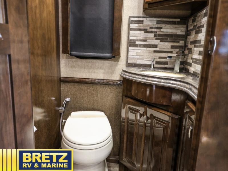 Proceeding toward the rear of the motor home you will find a half bath on the right. Here there is a toilet, sink, and an overhead cabinet.
