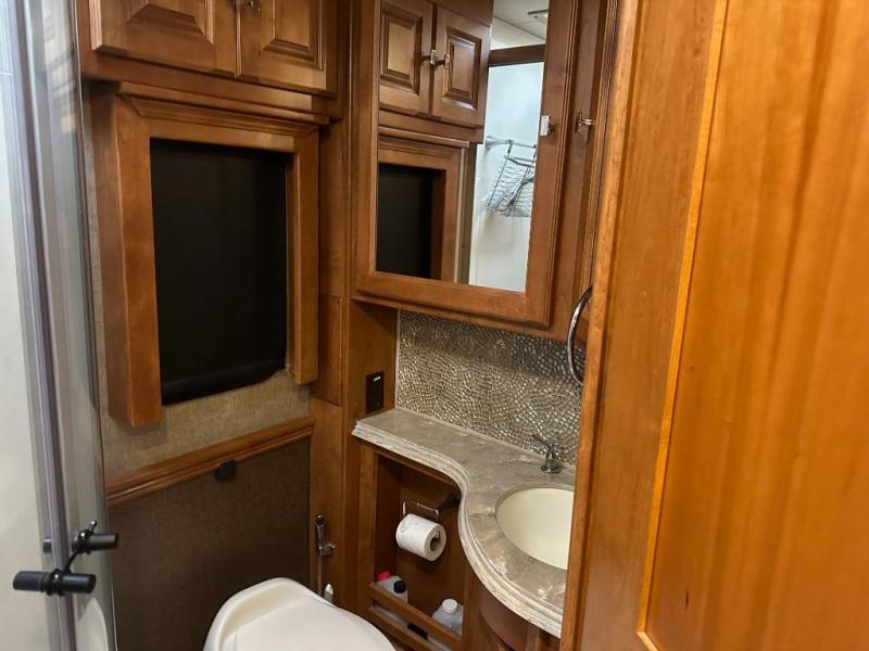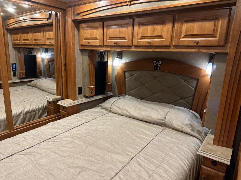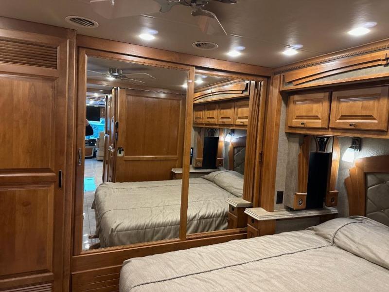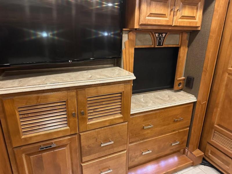This Tiffin Phaeton 36 GH class A diesel motorhome offers a rear bedroom. The bed is within a slide out, and there is a nightstand on each side and overhead cabinets above the head of the bed. The rear wall of the coach has a large closet as well as a corner closet where you can add an optional washer/dryer. The wall opposite the bed includes another slide out with an overhead cabinet, a TV, a hamper, and drawers below.