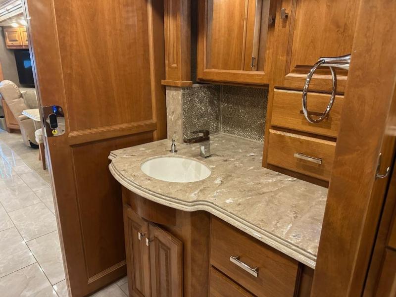 Just outside the bedroom, this slide continues with overhead cabinets and a large vanity with sink. A side aisle bathroom is across the hall and includes a corner shower, toilet, and corner vanity sink.