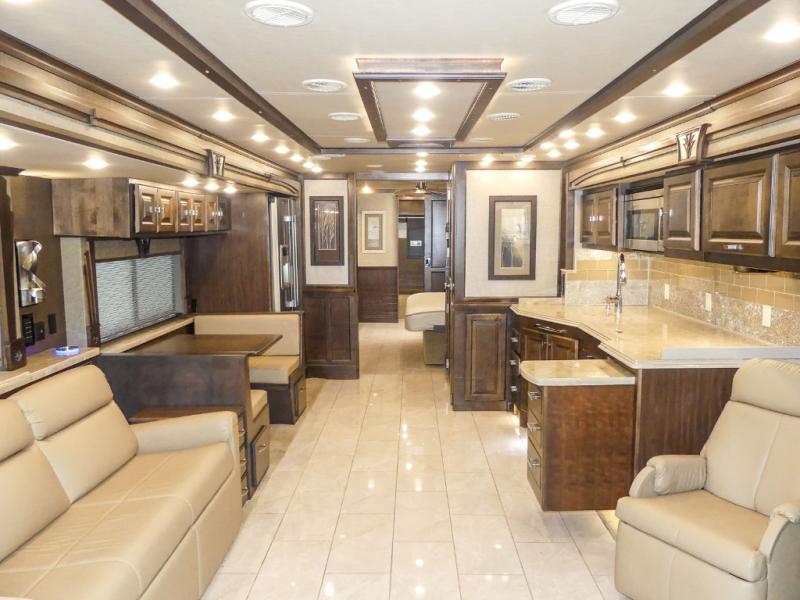 The slide out behind the passenger seat has a TV, sofa bed, booth dinette, and a residential refrigerator. Along the opposite side of the motor home you will find that the slide has a sofa bed, convection microwave, range, double kitchen sink, and overhead cabinets.
