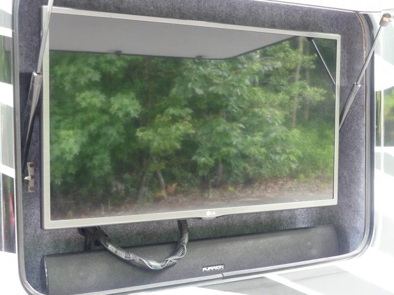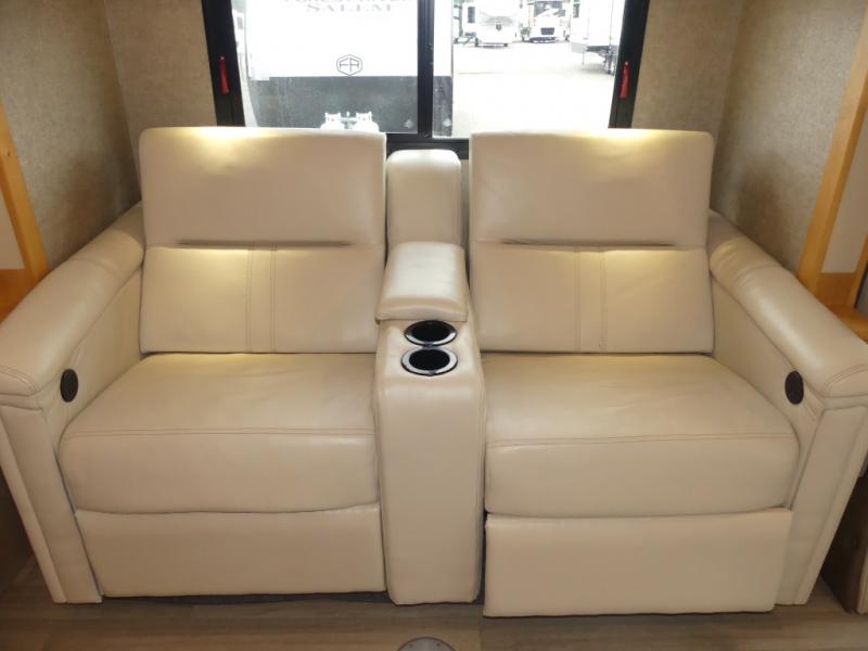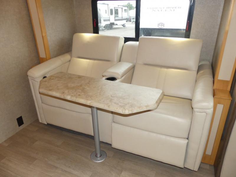 Straight ahead through the entry door you will find a theater seating slide out along the road side and overhead storage for your things. You can easily view the TV located above the entry door from this space.