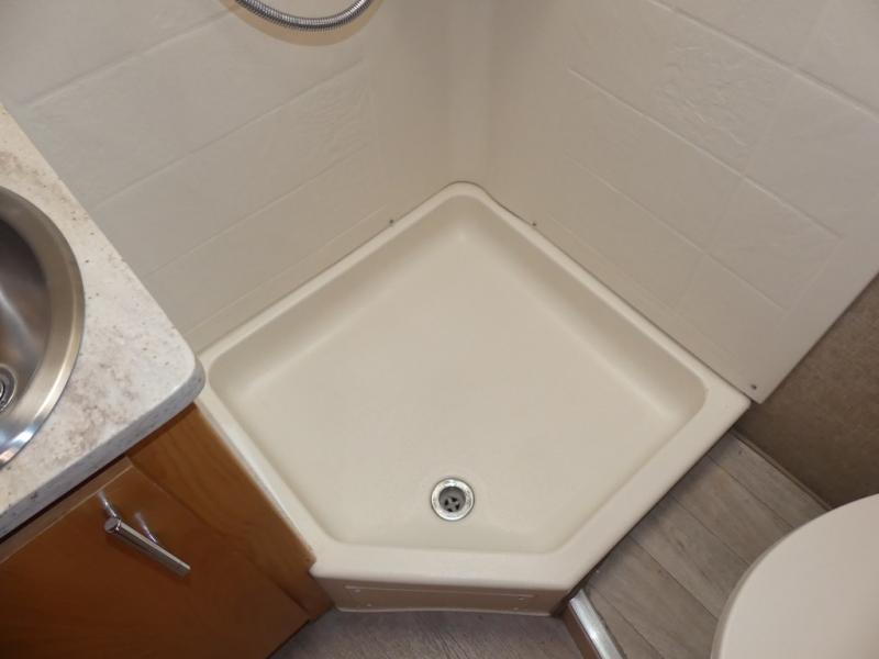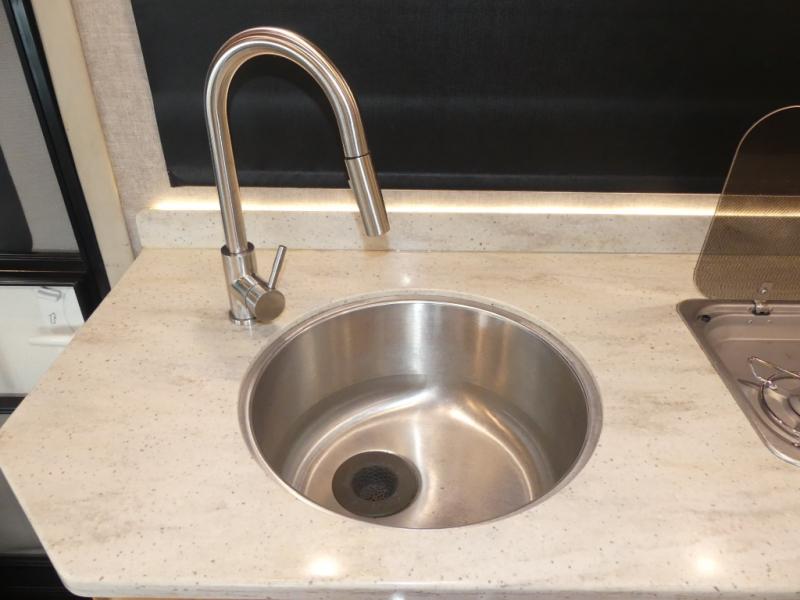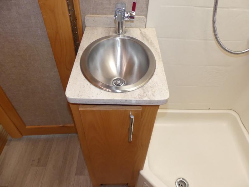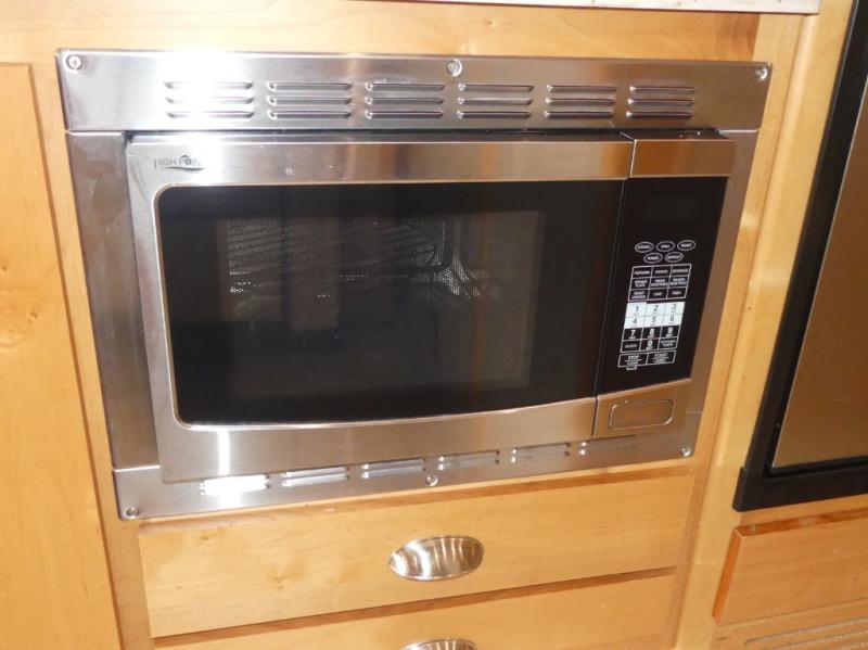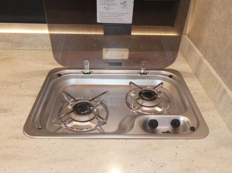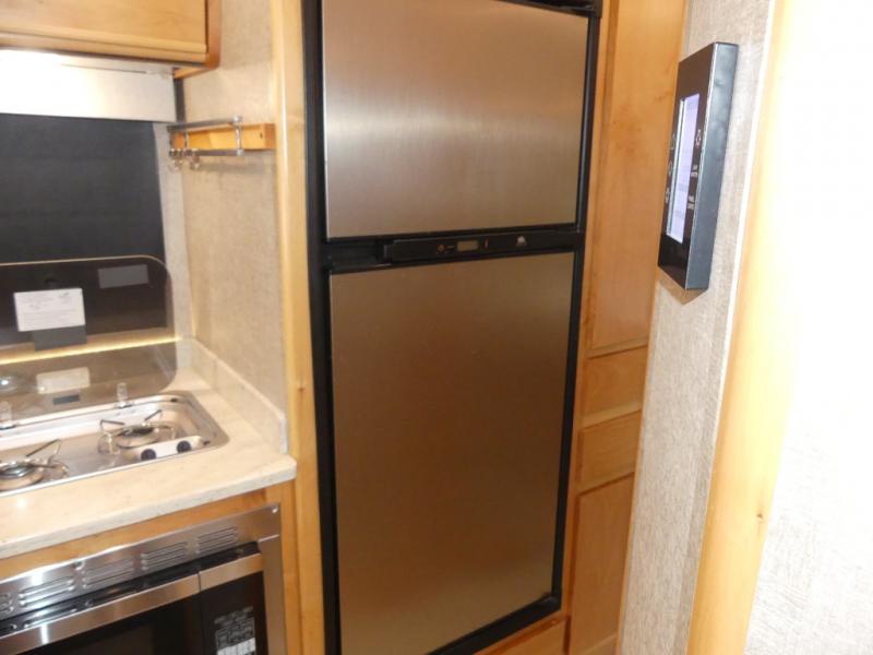 To the left of the entry enjoy your kitchen space which features a round sink for cleaning up, and a two burner cook-top along with storage overhead for your dishes and things. The refrigerator is along side the stove, and has a convection microwave oven located above it. You will easily be able to cook light meals for your family while you travel.