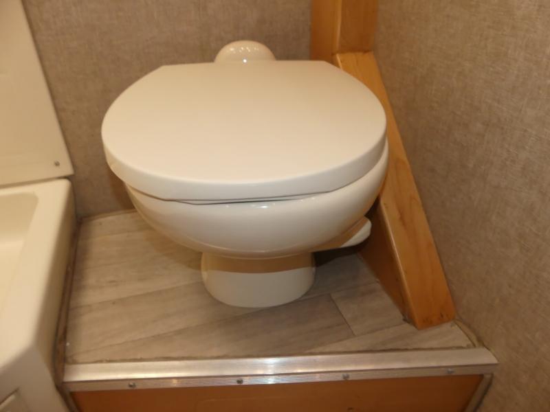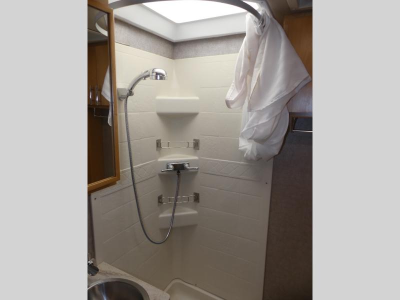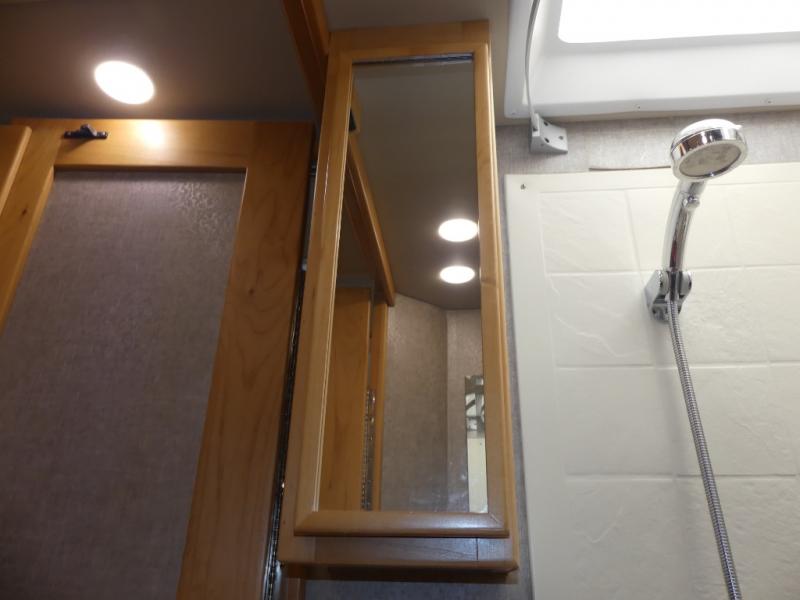 Opposite the refrigerator you will find a full bath including an angled shower, a toilet, and a vanity with sink. There is overhead storage above the sink and toilet, plus a wardrobe opposite along the curb side for your clothing. The door can close off the bathroom area, or it can close off the bed and bath from the rest of the coach.