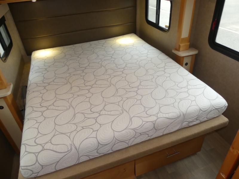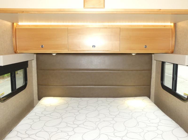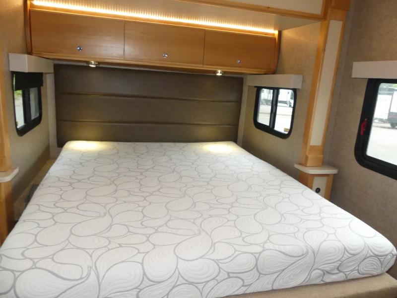 In the very rear of this Wayfarer class C you will find a spacious bedroom thanks to a rear slide out queen size bed including nightstands. There is overhead storage at the head of the bed, and a space for a TV on the outer wardrobe wall just off the foot of the bed along the curb side, plus so much more!