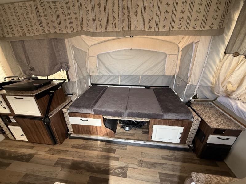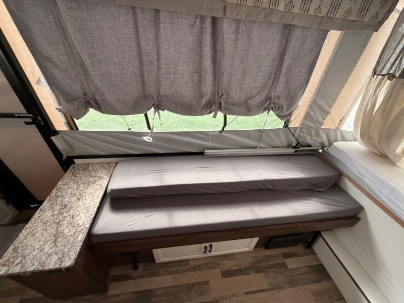 On the inside of this pop-up camper you will enjoy plenty of space with a slide out dinette and table that can be used inside or outdoors. There is lounge seating as well as plenty of storage in the provided cabinets, plus more storage under the dinette bench seats.