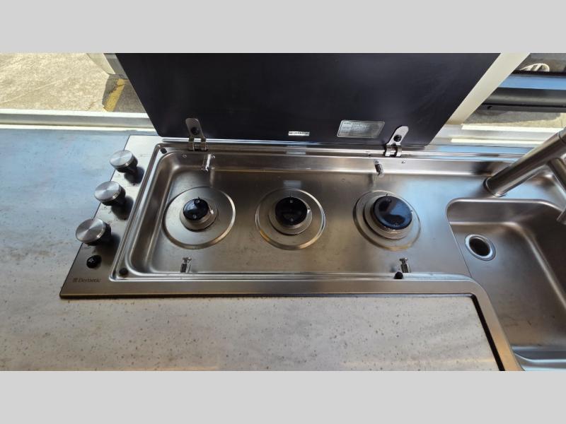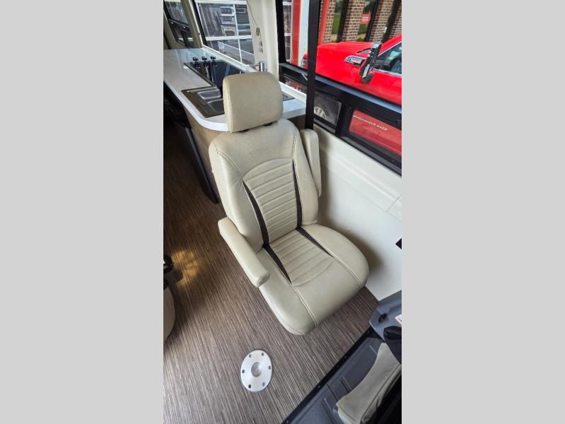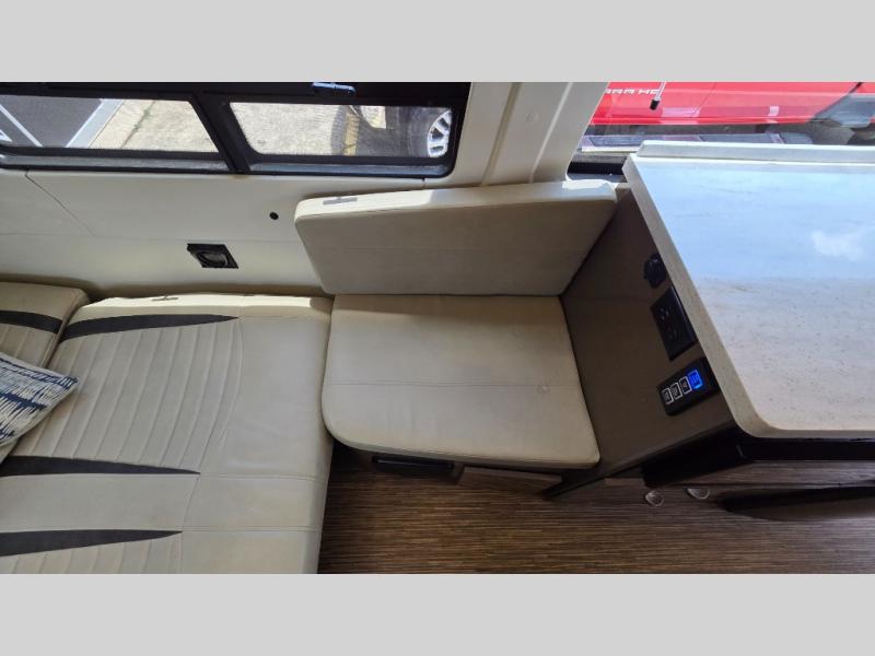 Through the sliding doors you will notice a nice seating area up front. Two additional chairs, along with the cab swivel seats makes a nice seating area for you and your guests. There is a movable pedestal table for added convenience, as well as the option of adding a storage/wardrobe cabinet in place of the forward facing seat behind the driver's seat.