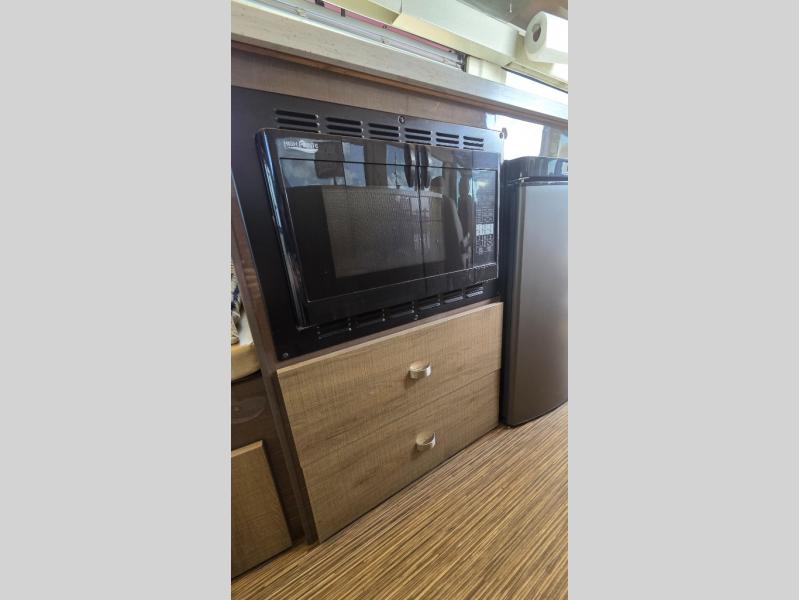 Opposite the bath there is a large counter area with a three burner range top and a refrigerator below. There is also a kitchen sink, and plenty of overhead storage, plus microwave oven as well.