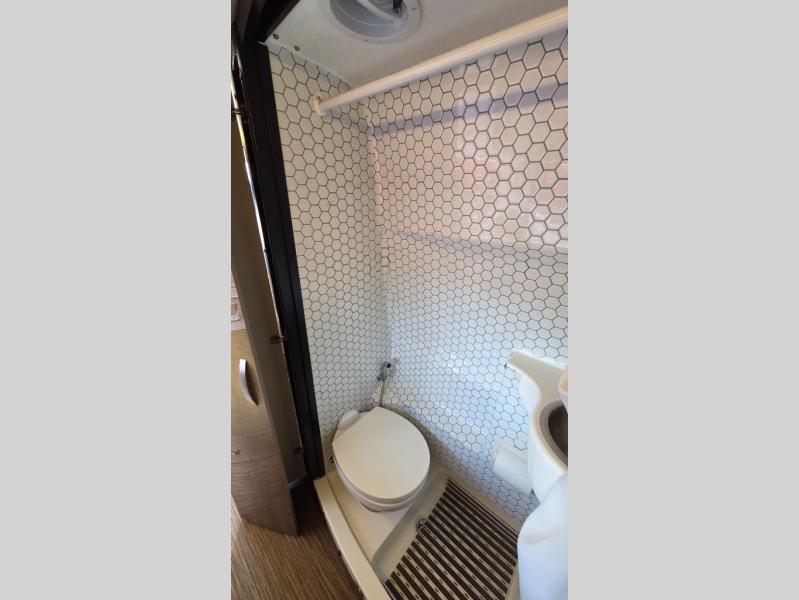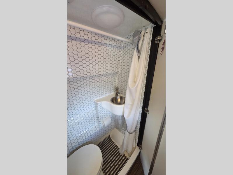 A side bath/shower area is featured along the curb side behind bi-fold doors. Inside find a vanity with sink, a toilet, plus a shower.