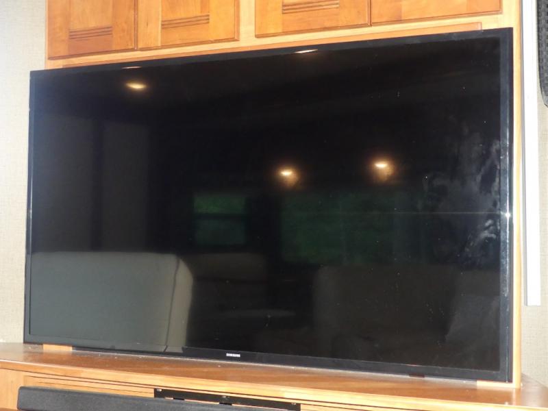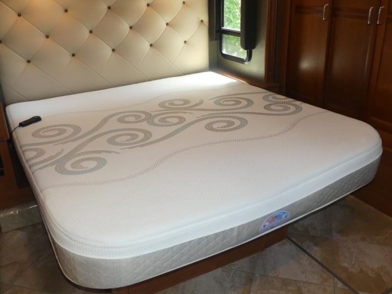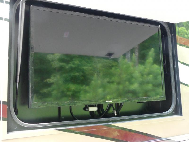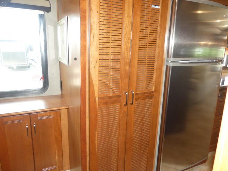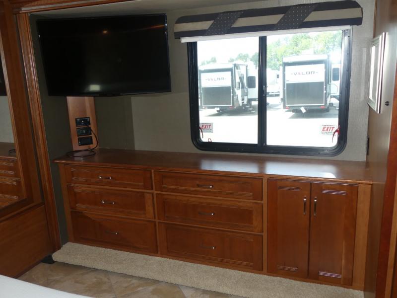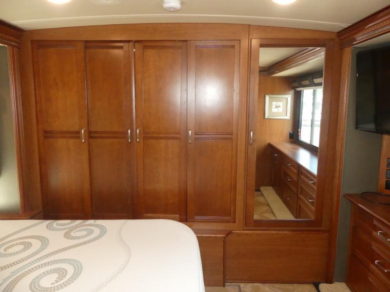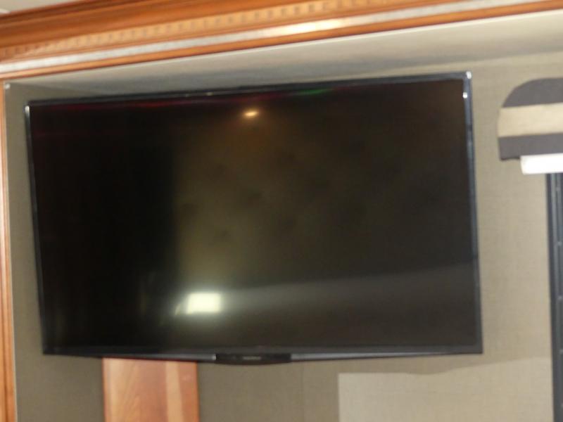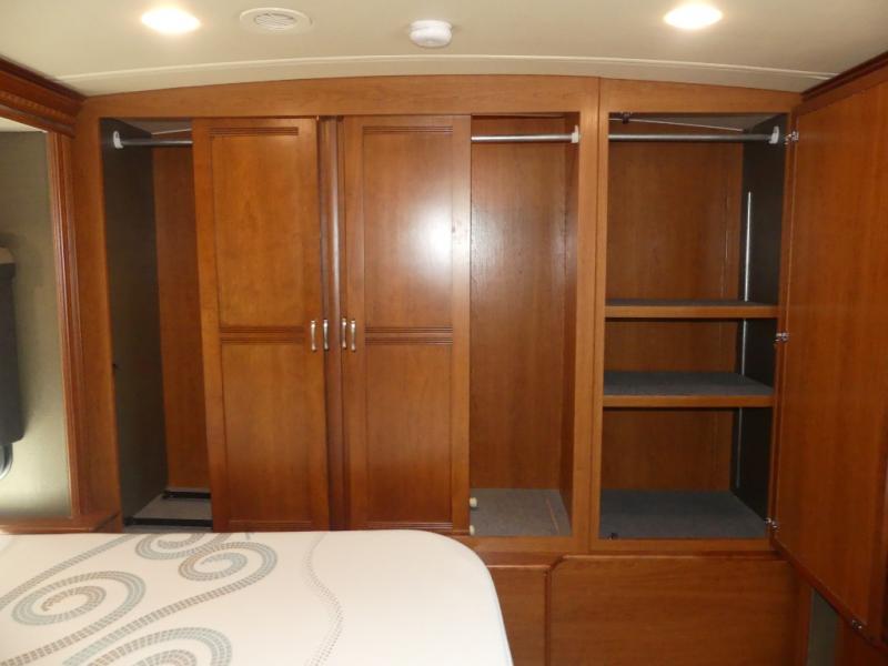 The rear master bedroom features a queen bed slide including nightstands and overhead storage. The chest of drawers opposite is part of the large slide on the road side that also features the kitchen appliances. Here you will enjoy storage drawers for your things, plus there is a 40" HDTV as well. Along the rear wall find even more storage with a wardrobe and more cabinetry. You can also choose a king size bed if you wish for a bit more sleeping space, plus so much more.
