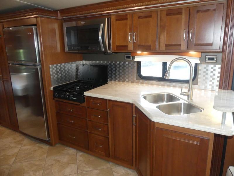Heading further back you will enter into the kitchen and bath area. The kitchen begins at the head of the driver's side slide out with an angled double sink, a three burner range, and a residential refrigerator. There is also a storage cabinet which has been prepped for a washer and dryer in case you choose to add.