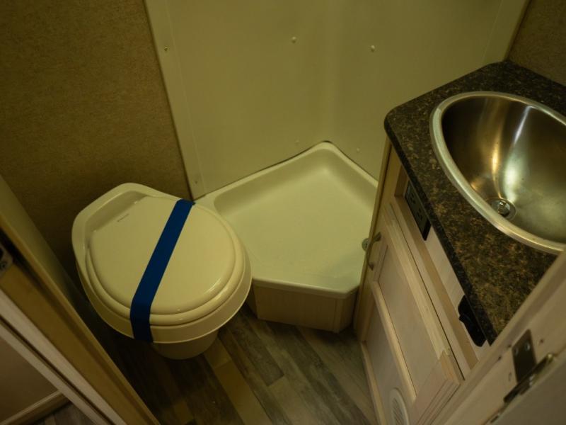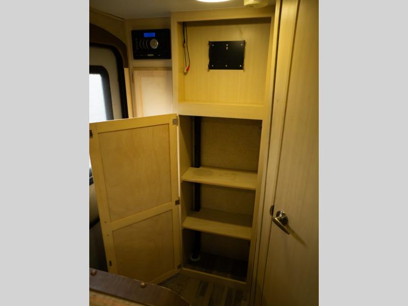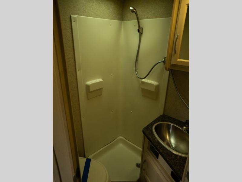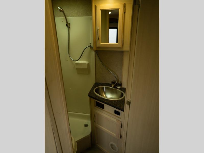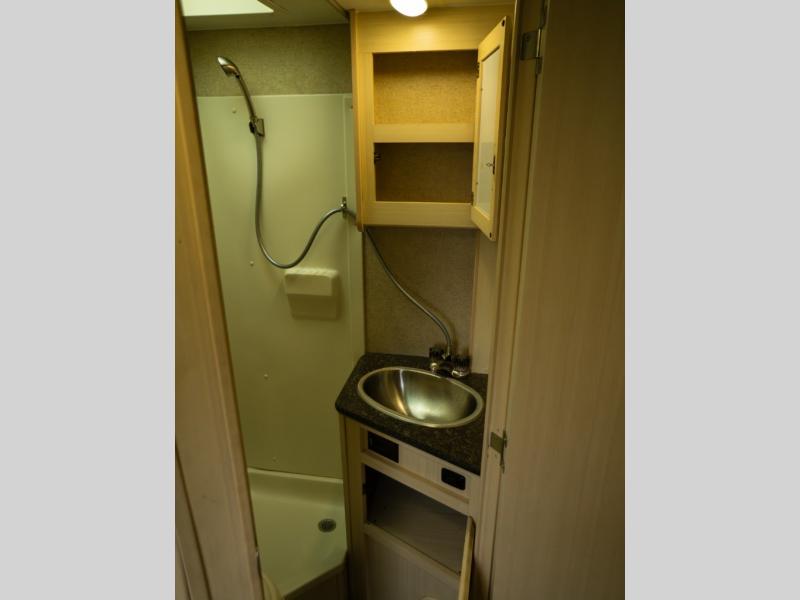 Step inside model 1706FB and find a storage pantry just inside the door on your left. Next, find a wardrobe with an LCD TV. Continue ahead and there is a convenient rear corner bath including an angled shower, a toilet, and a sink with medicine cabinet above.