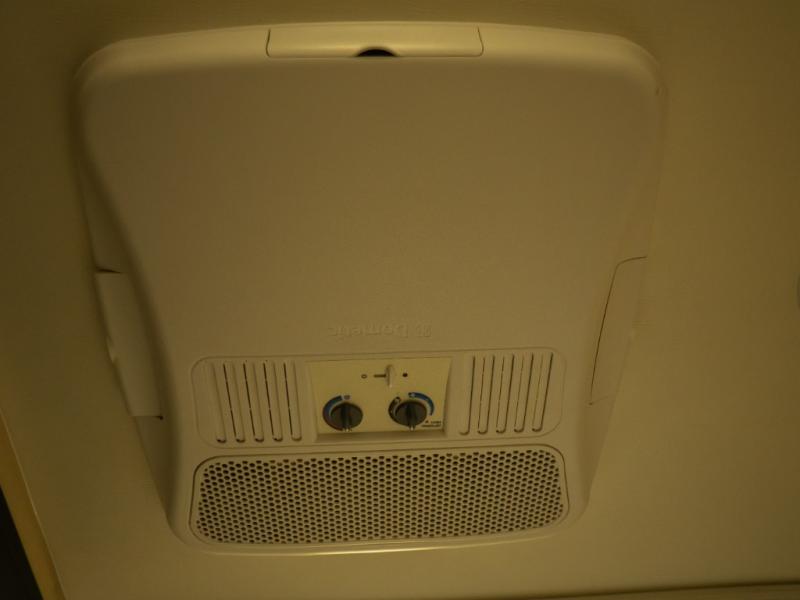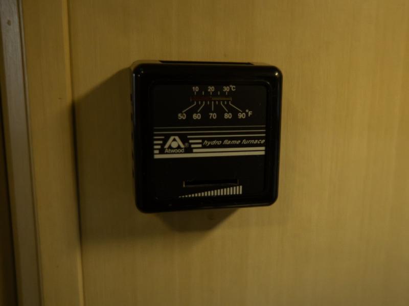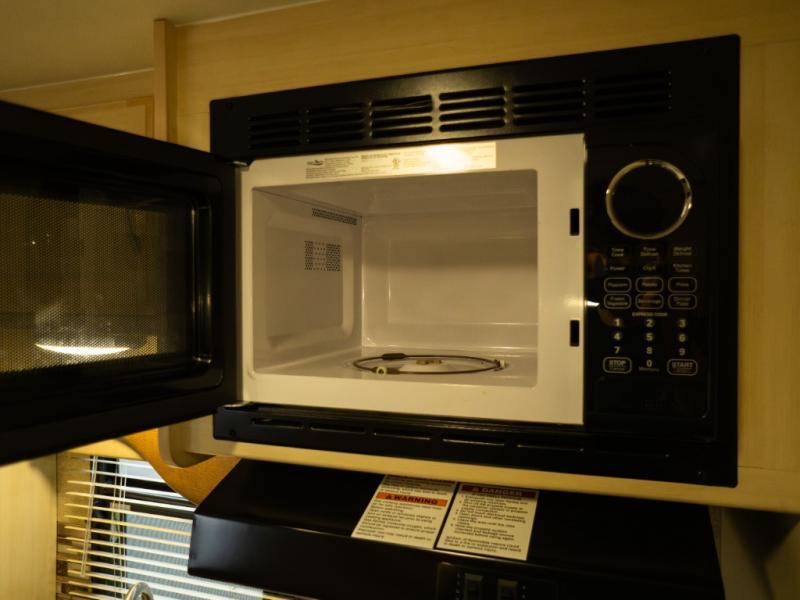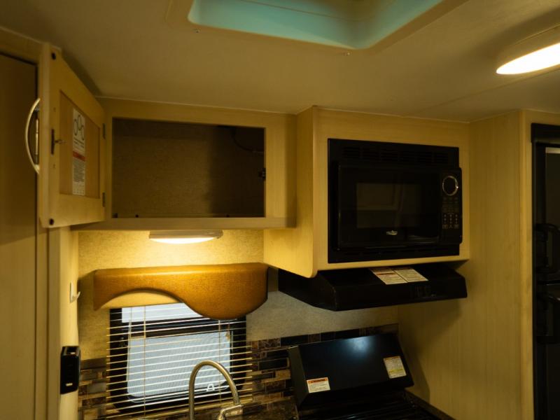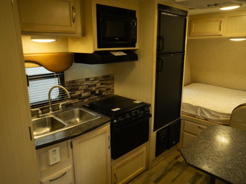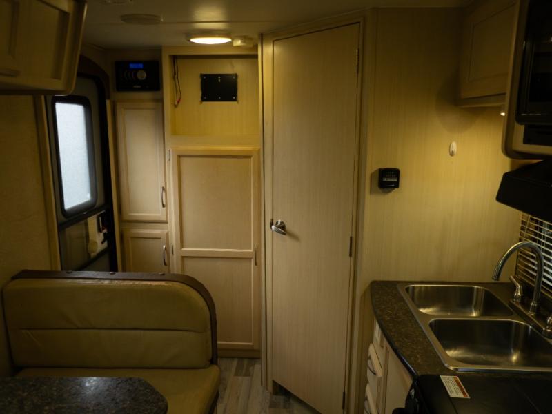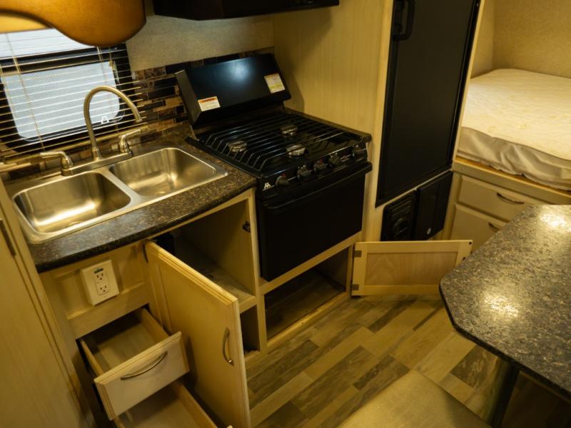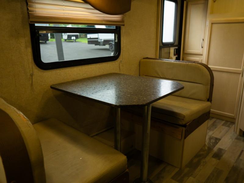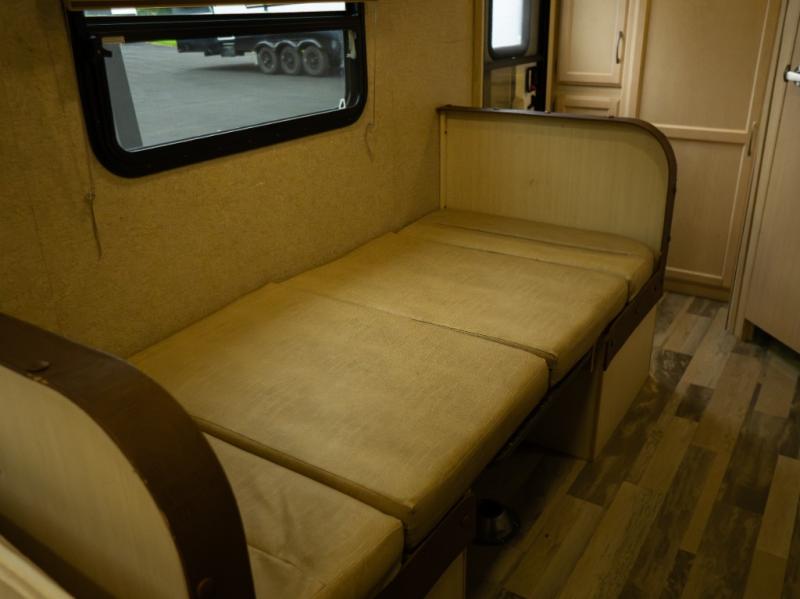 There is a booth dinette with overhead cabinets to the right of the entry door where you will easily be able to enjoy a meal while camping.