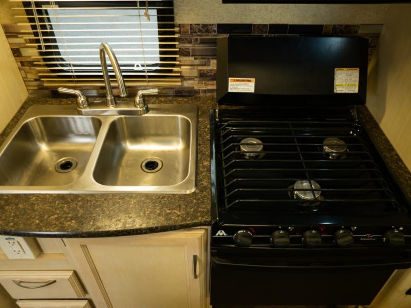 The kitchen area features a double sink, a two burner range-top, and a refrigerator to keep your perishables cold and fresh. You will also find plenty of cabinets to store all of your dishes and things in.
