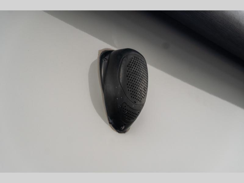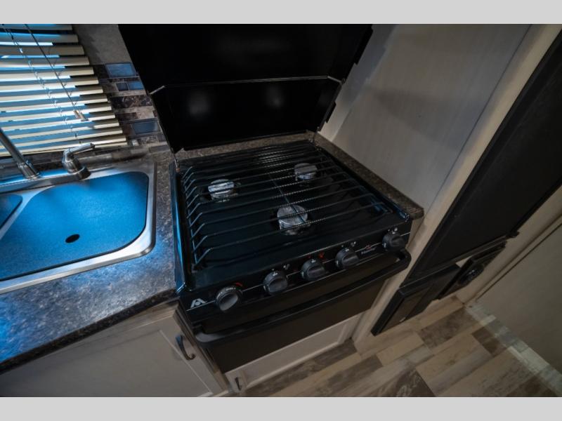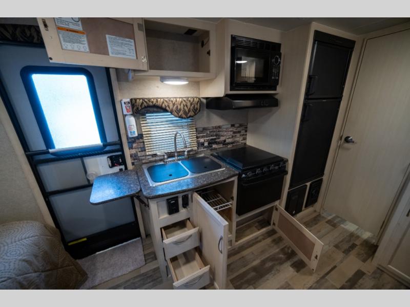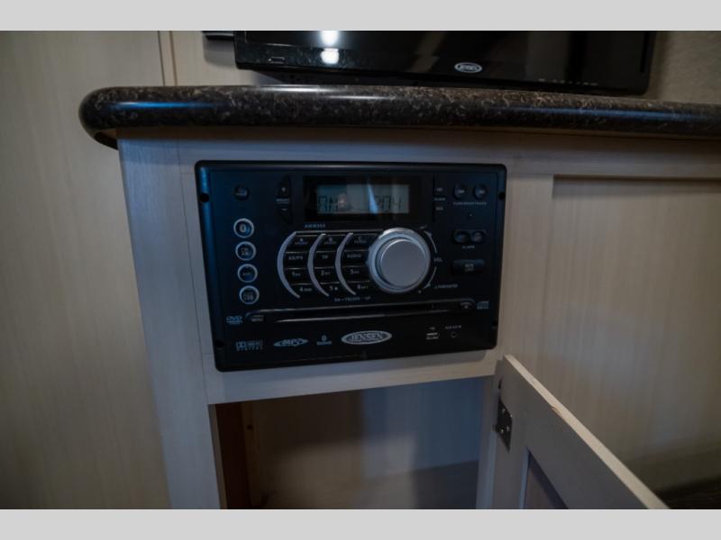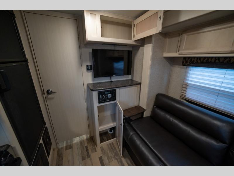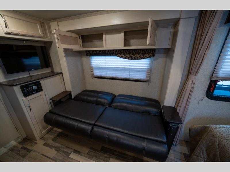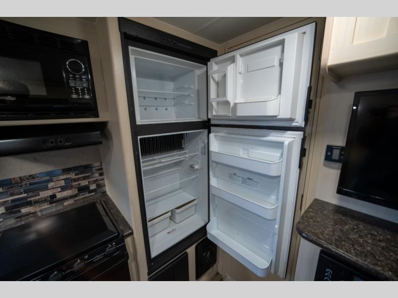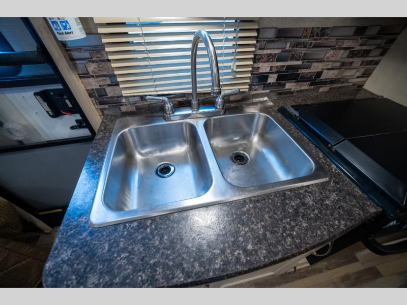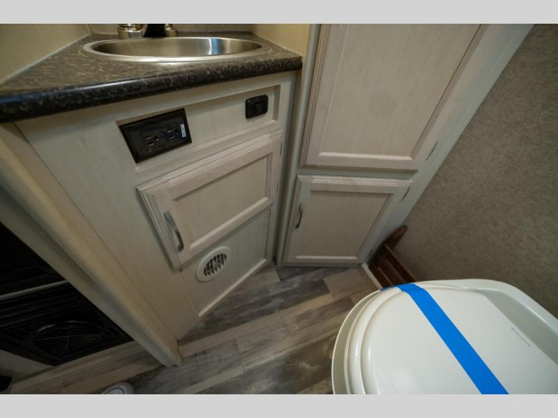 The second sofa is on a slide along the road side wall. Above the sofa there is overhead storage which helps to keep your things neat and tidy. You can enjoy meals at the sofa as there is also a table in front of it. Adjacent to the slide is a TV and pantry. On the opposite side of the trailer you can prepare your favorite meals using the two burner range and microwave oven, plus clean up easily at the double kitchen sink. You will also find a refrigerator for your perishables.