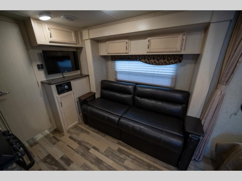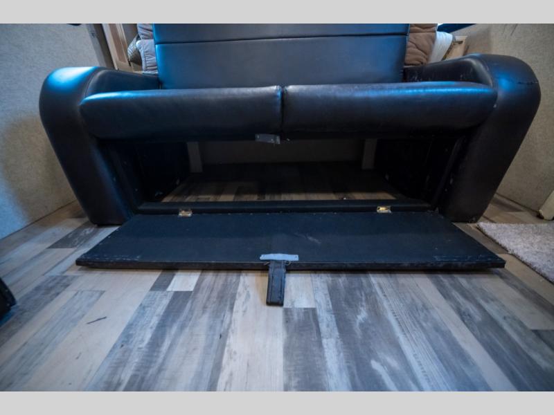As you enter this travel trailer, along the front there is a sofa, and behind the sofa you will find a fold-up queen bed. On one side of the bed there is a wardrobe, and the other side has a nightstand.