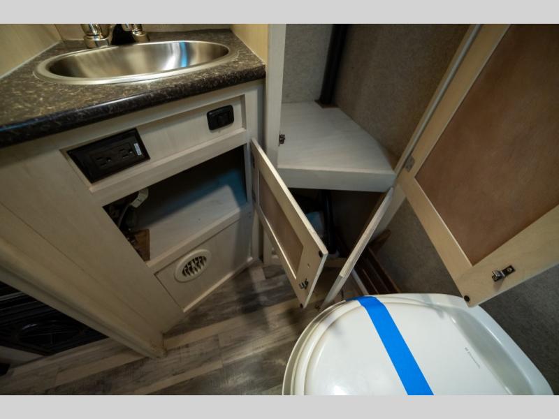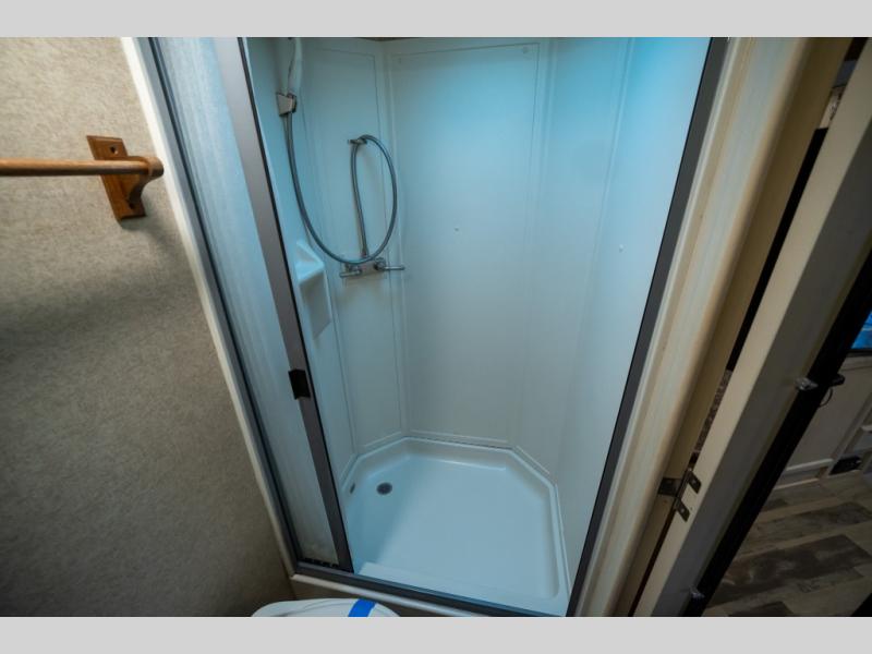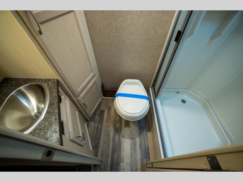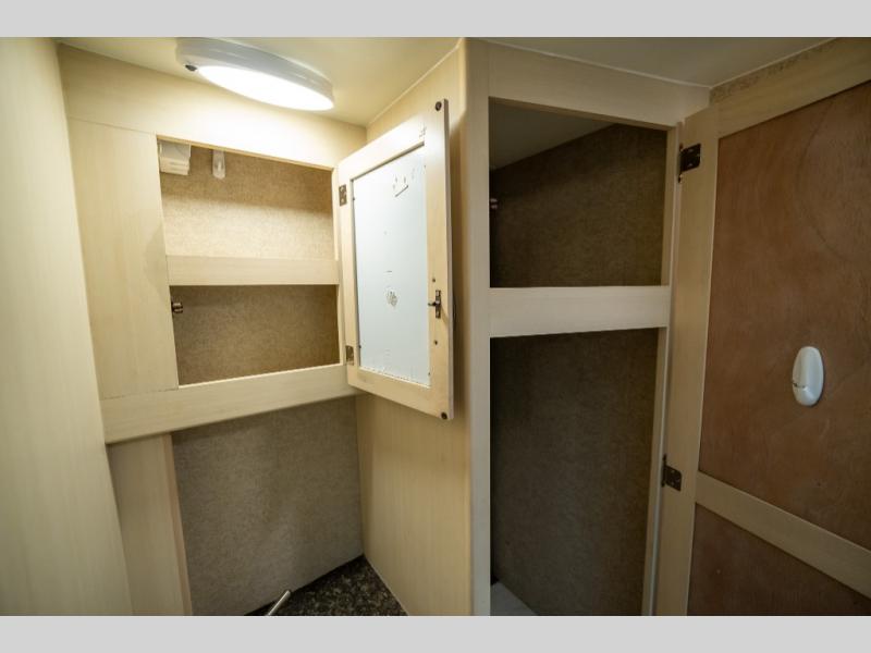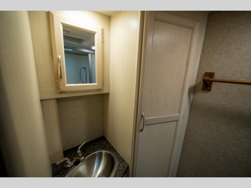 Located in the rear of the trailer is the bathroom. Inside find a shower, toilet, wardrobe, sink, and medicine cabinet, plus more!
