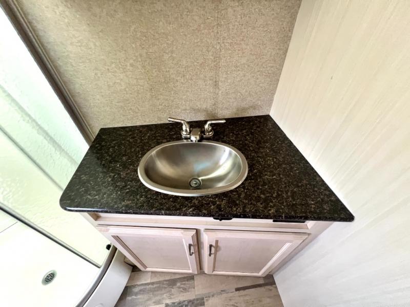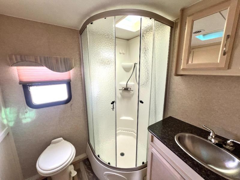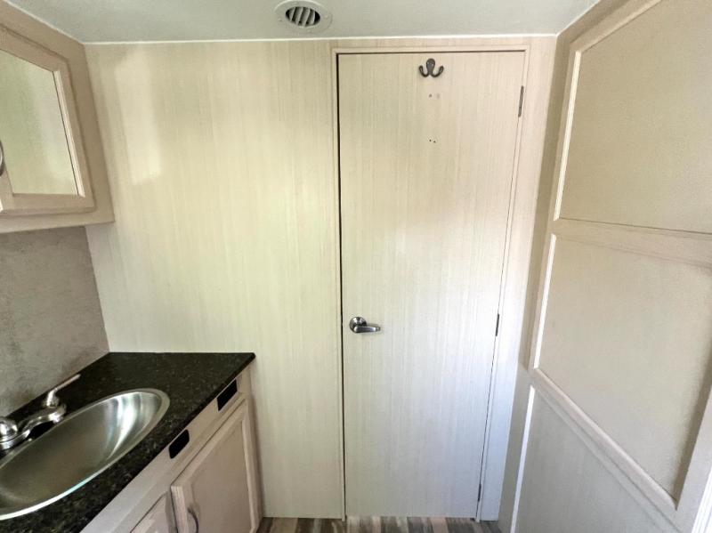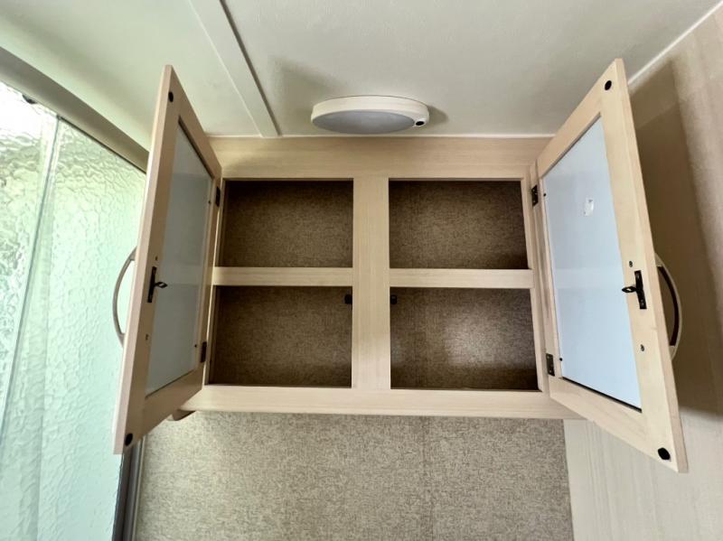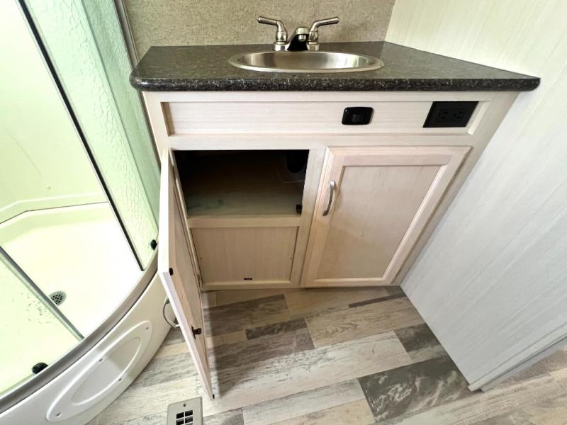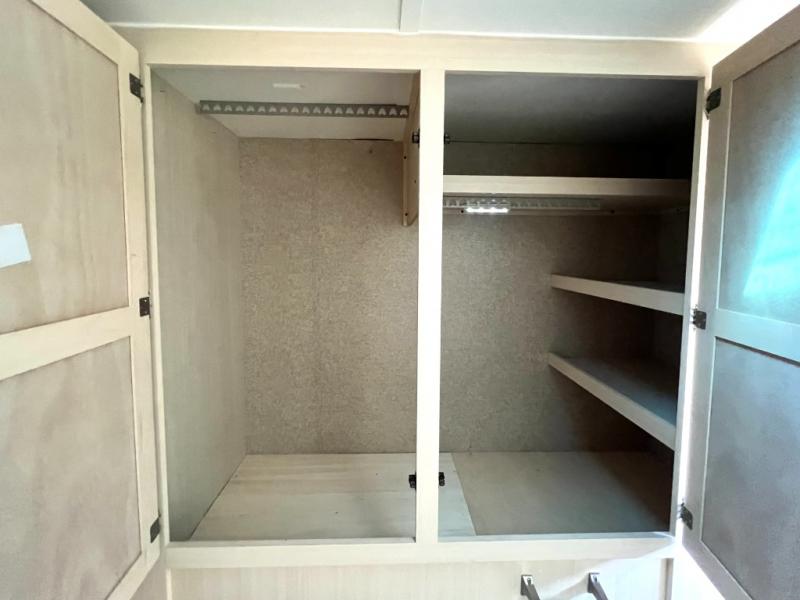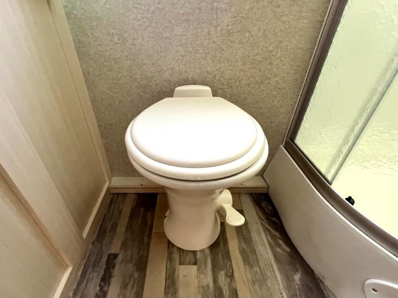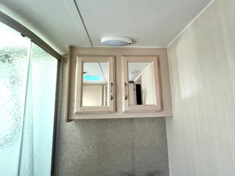 The rear features a spacious bath with a corner shower, a sink with medicine cabinet, a toilet, and a large wardrobe for all of your clothing and linen storage.