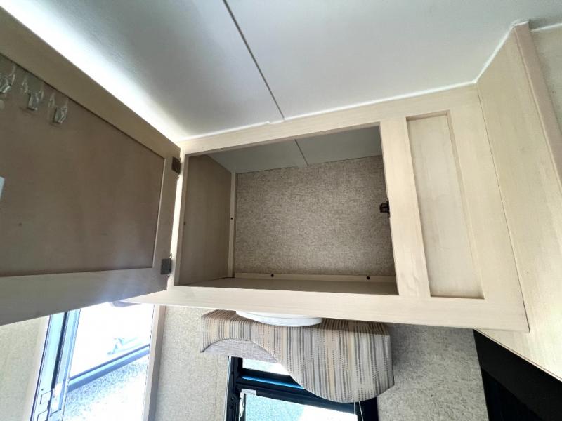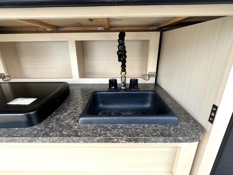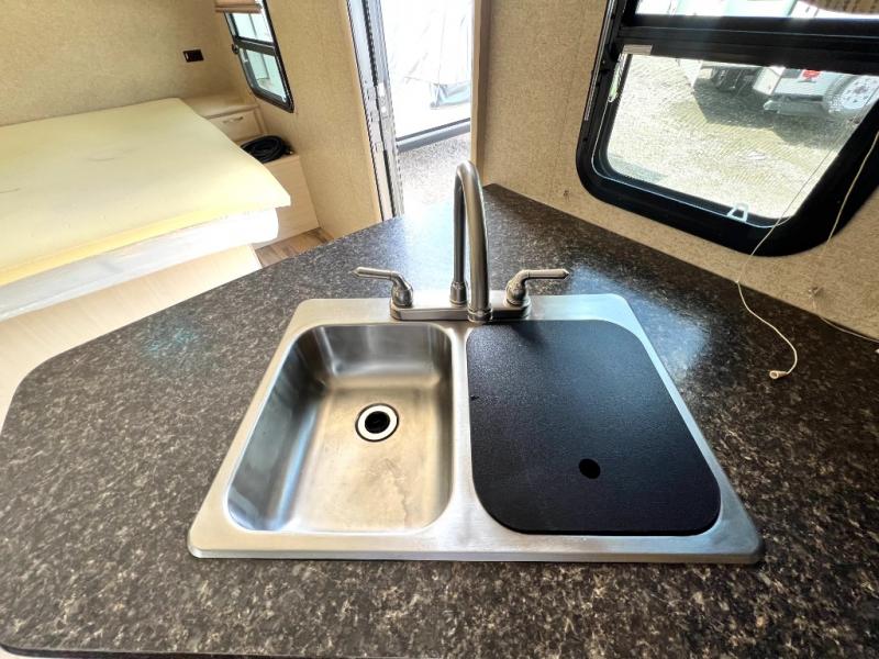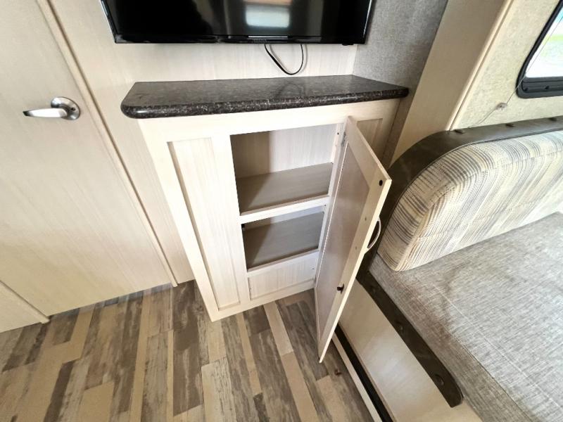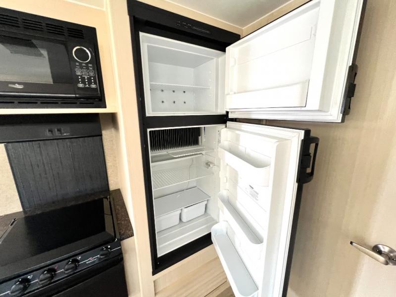 To the left of the entry door there is a kitchen area which includes a refrigerator, a three burner range, and a double kitchen sink with overhead cabinets for storing your daily dishes and things. A small TV/pantry can be found just off the u-shaped dinette slide. This is where you can store your canned and dry goods. The dinette is perfect for dining, but can also be used as a bed if needed at night for family or friends.