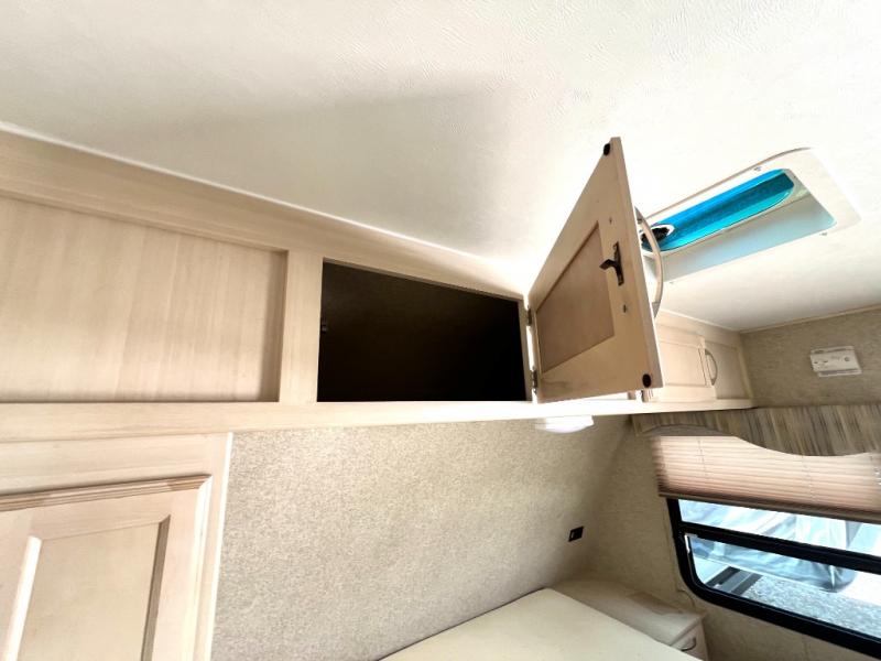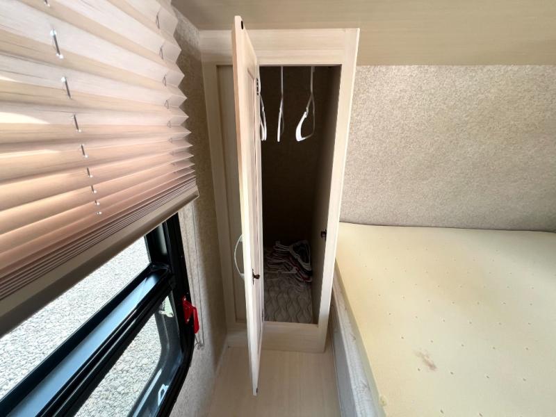 As you enter notice the front queen bed with a bedside wardrobe and a nightstand, plus overhead cabinetry for additional storage. There is also a curtain for privacy that can be pulled when sleeping or getting dressed.