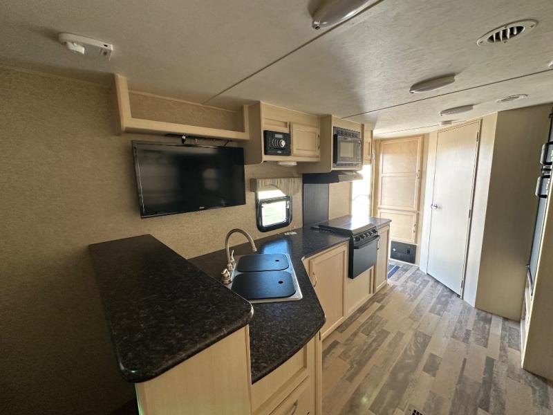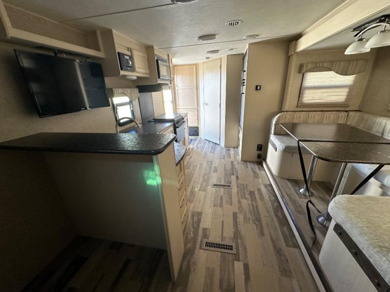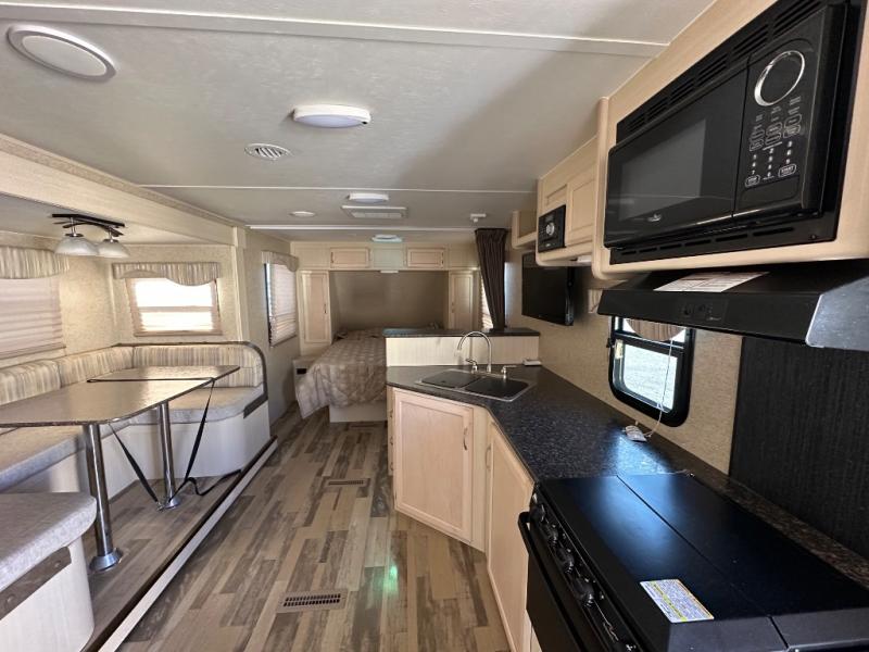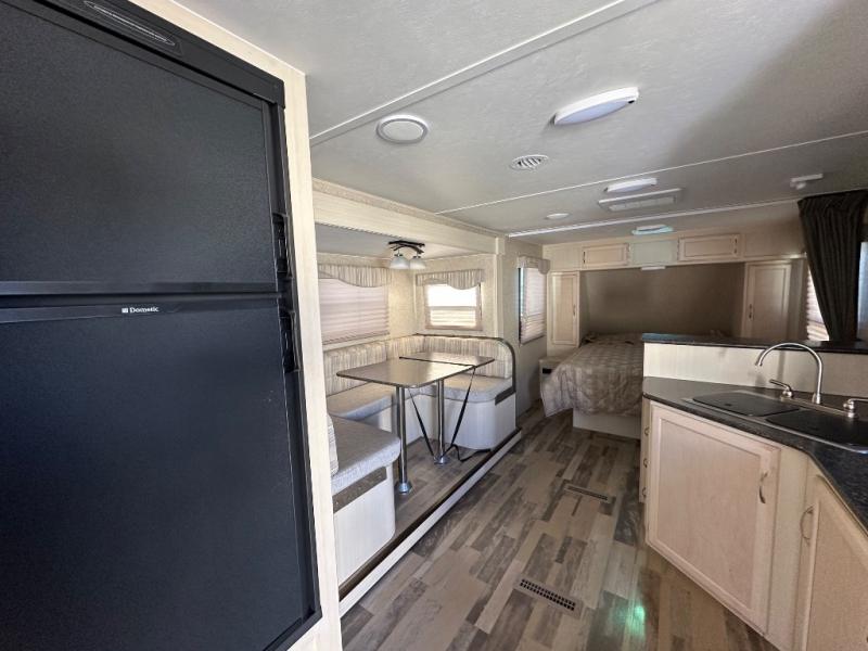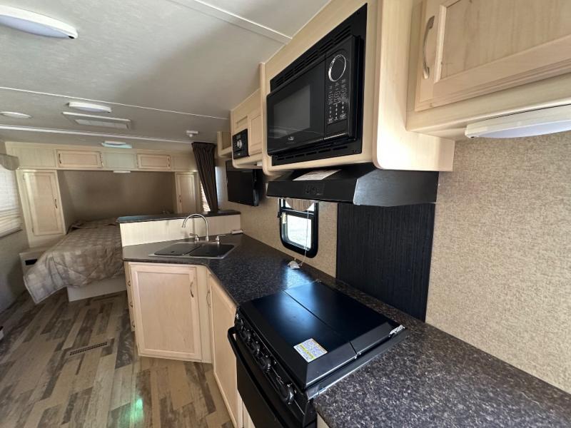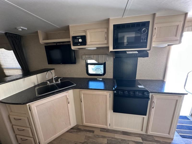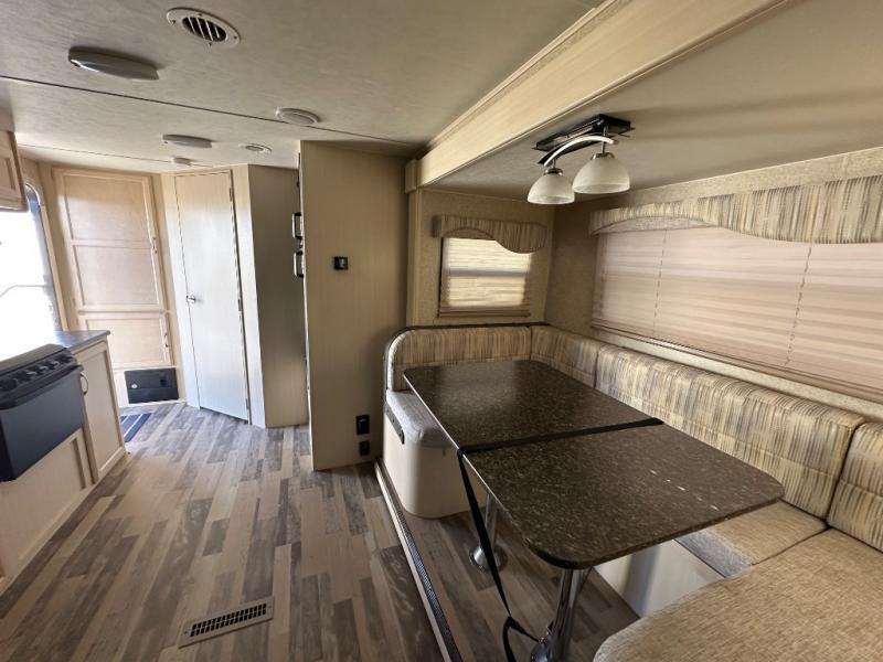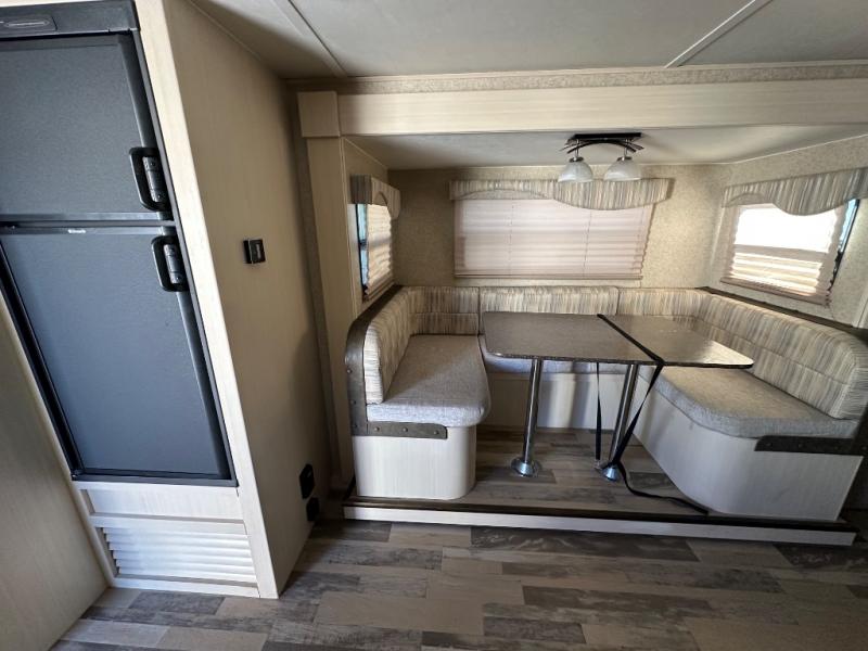 You will have no trouble cooking in this Minnie travel trailer with the kitchen area to the right of the entrance. Here you will find ample counter space for food prep, a three burner range, and a double sink. There is a refrigerator just off the 44" x 84" u-shaped dinette slide that is along the road side. You will also find plenty of overhead cabinets for all of your dishes and kitchen items above the sink and stove top area.