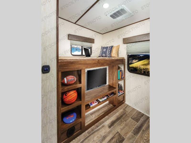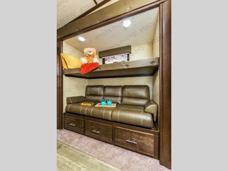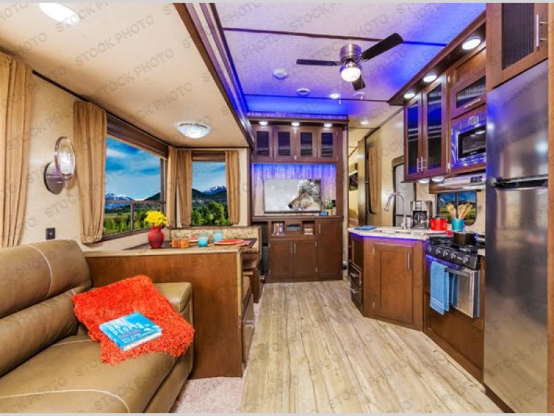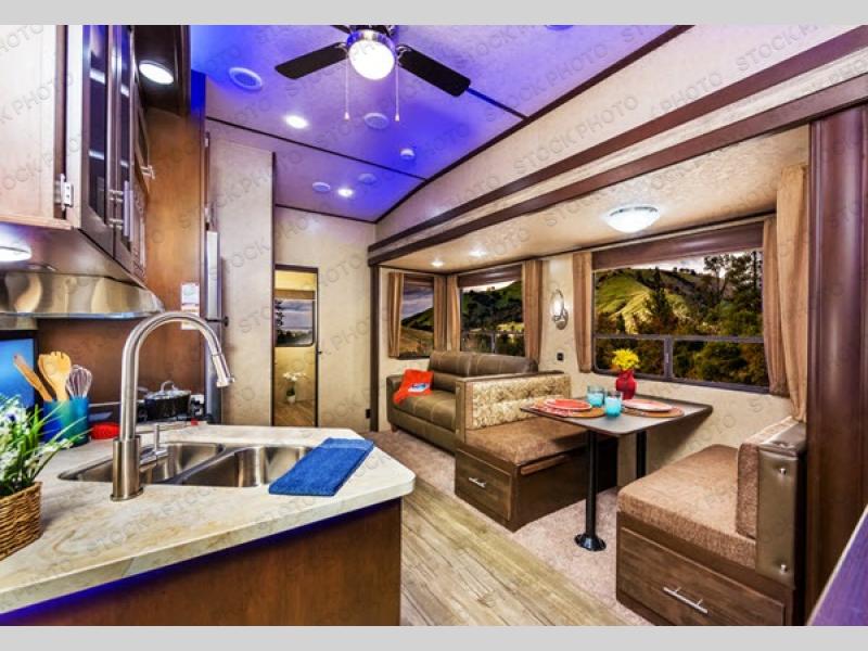 Step inside to your right to a booth dinette with overhead storage. Across from the dinette is the kitchen slide out. You can easily cook meals and prepare snacks in this Winnie Drop with the slide out refrigerator and microwave oven, two burner cook-top, and single bowl sink. There is also overhead cabinets for your dishes.