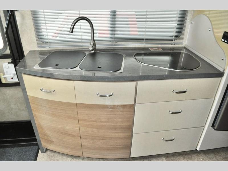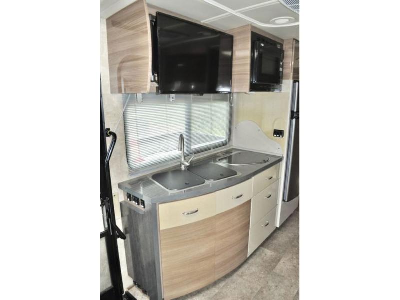 The kitchen area is to the left of the entry door and features a double sink, a two burner cook-top, and refrigerator. You will also find plenty of overhead cabinets for storage too. Above the sink area is where you will find a 28" HDTV for viewing when seated at the dinette opposite.