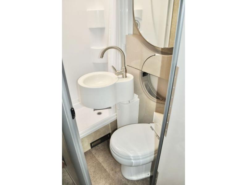 Beyond the dinette heading toward the rear of the coach you will find a side bath with a shower, toilet, and a unique swivel sink. A nice size wardrobe is found just around the corner from the bath along the curb side next to the refrigerator before you step into the bedroom floor area.