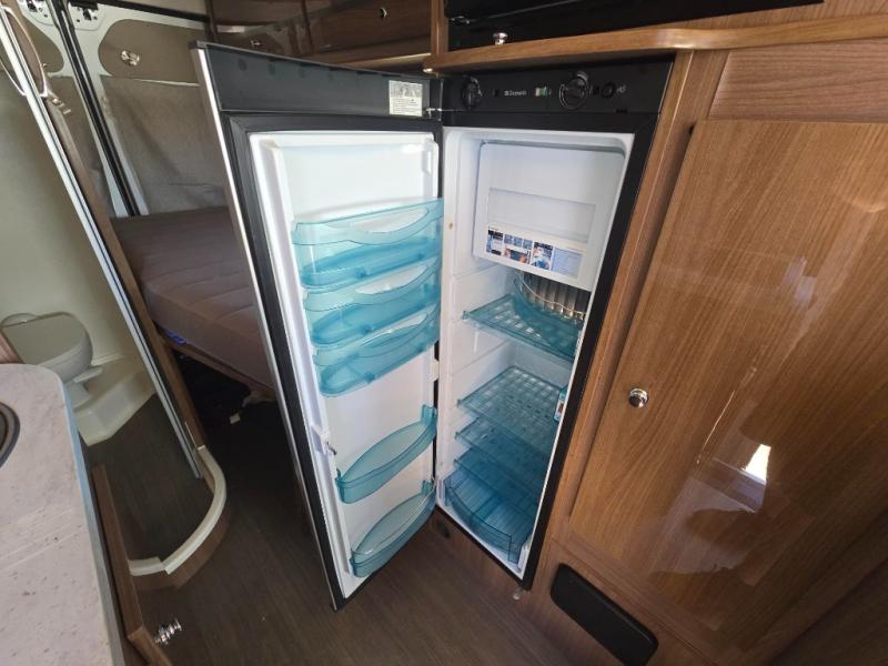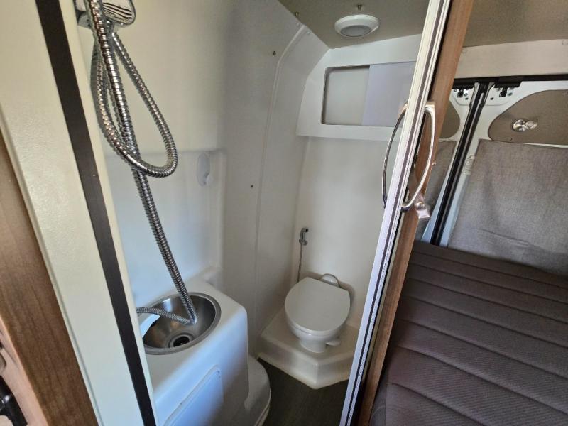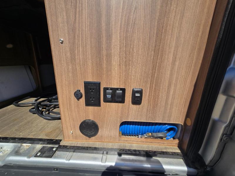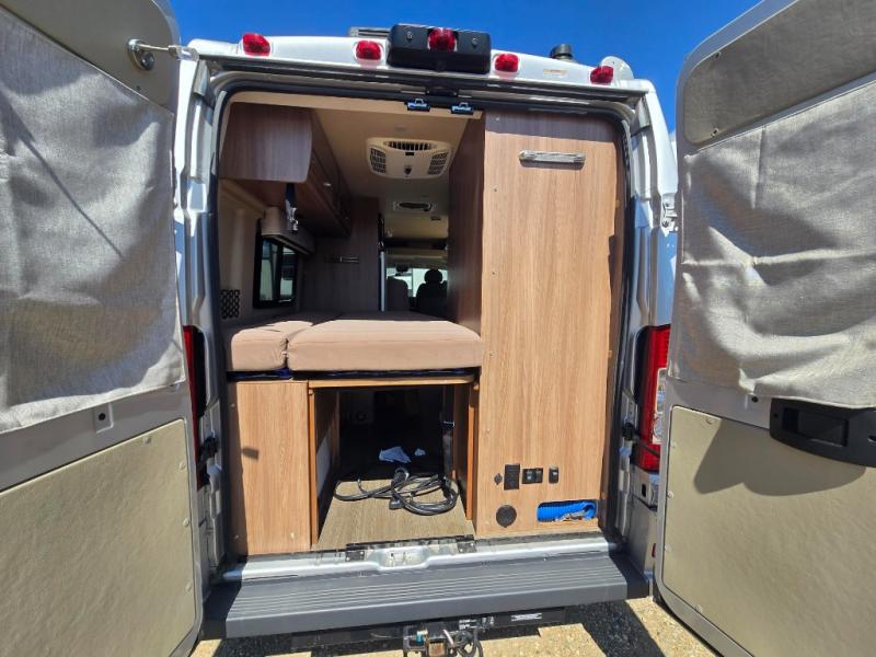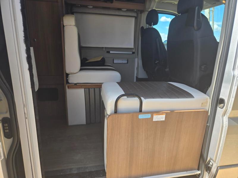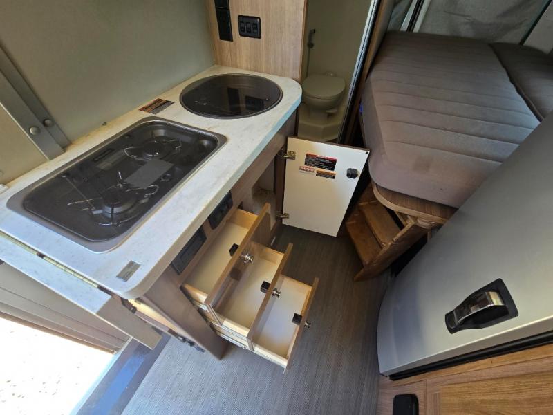 Cook up light meals and snacks with the two burner range top, refrigerator/freezer, and round sink provided. There are also storage cabinets for dishes and things. A bench seat and table behind the driver's seat and the side bench located behind the passenger seat is perfect for dining, and can also be folded down to create a 42" x 72" Flex bed for sleeping at night.