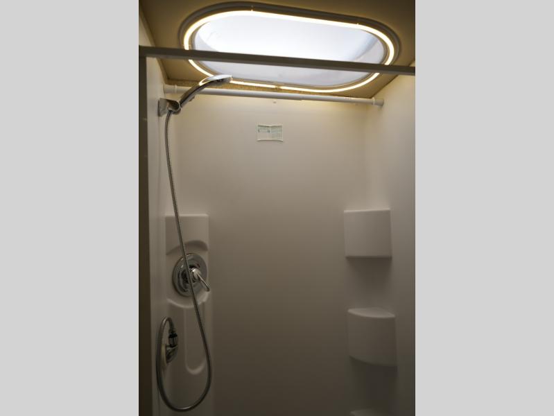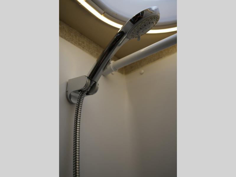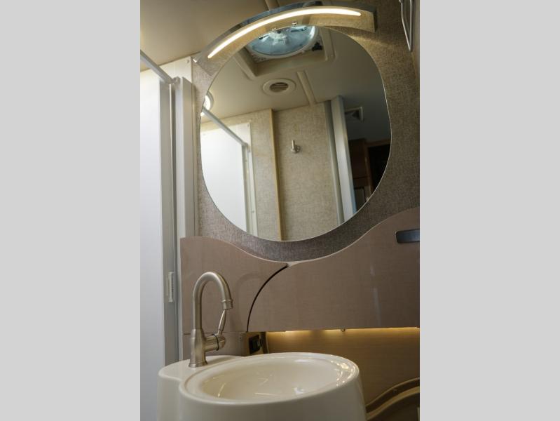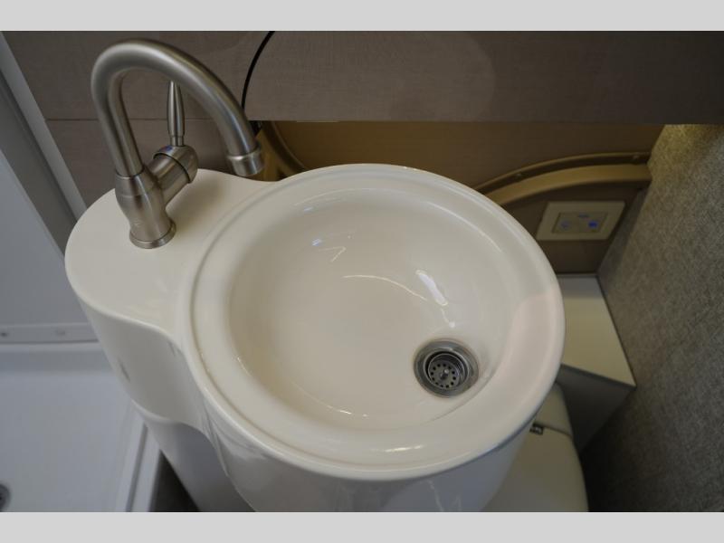 Side-Aisle Bath with a unique swivel sink, toilet, and shower for optimized space and function.