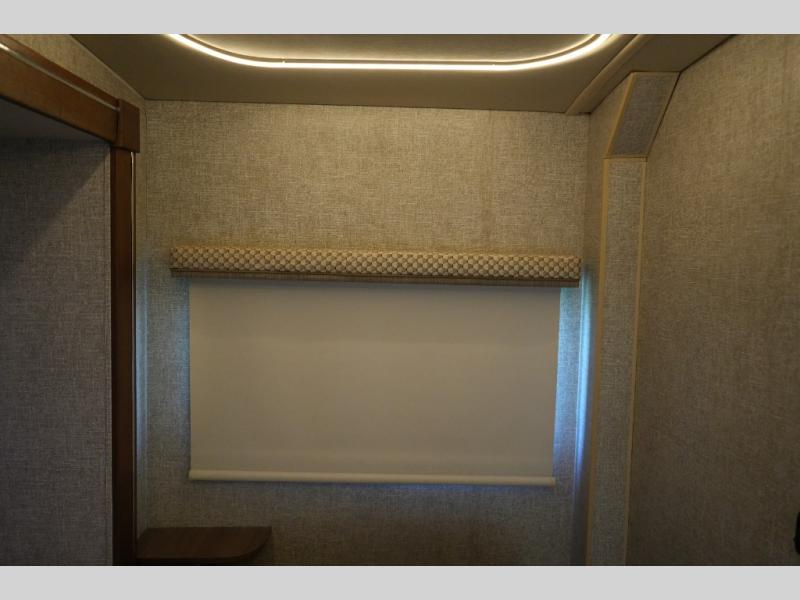 Rear Bedroom with Queen Bed in a slide-out, complete with overhead cabinets and an optional 24” HDTV.