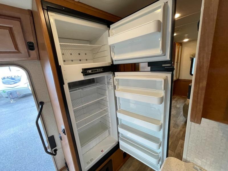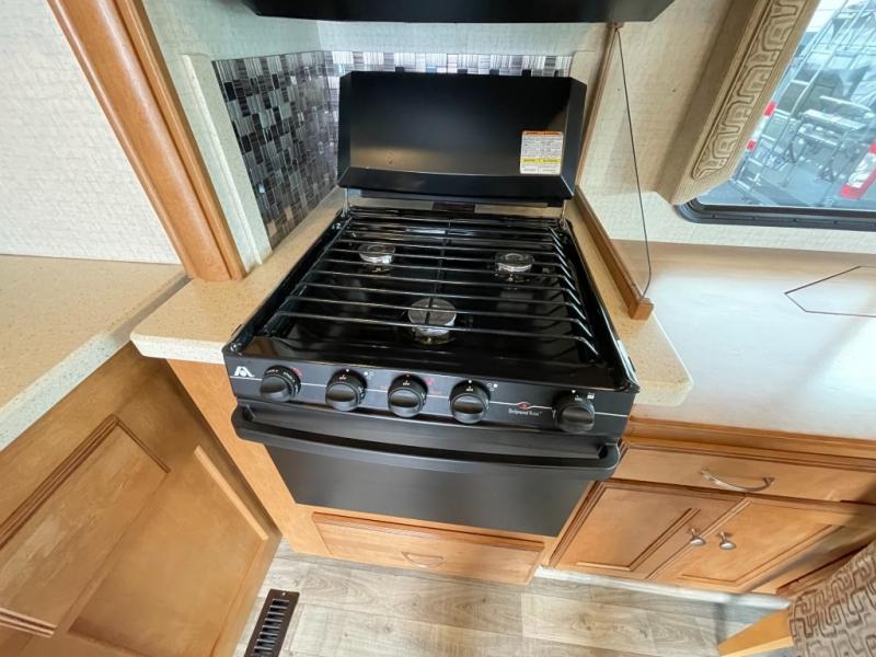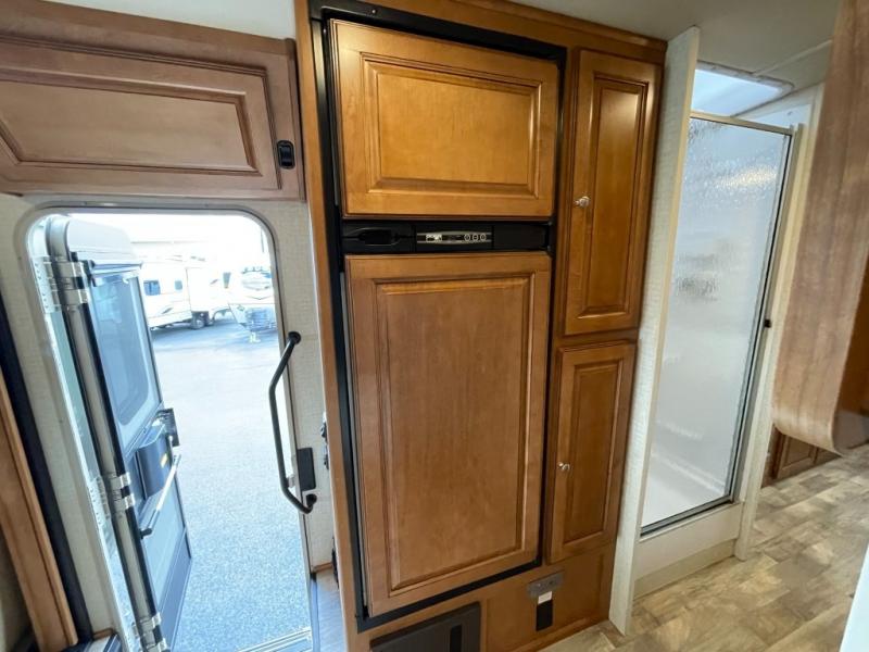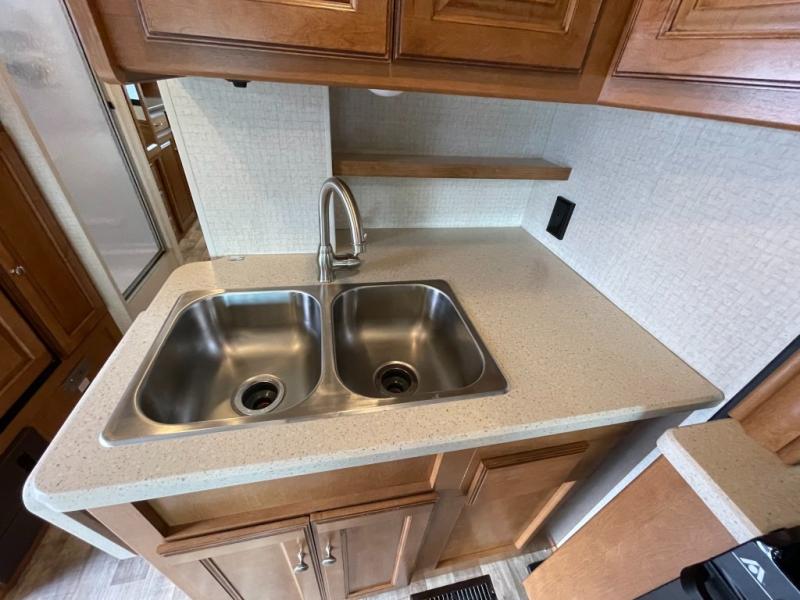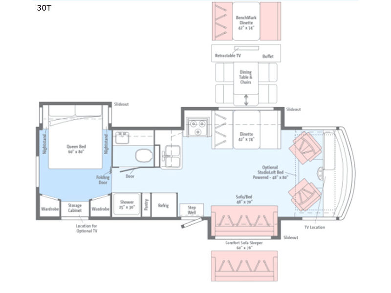 This coach features a wide open living area with dual opposing slides just behind the front cab seats that can swivel toward the rear for added seating. Plus there is an optional StudioLoft bed if you need additional sleeping space. The slide to the right of the side entry door features a 48" x 70" sofa bed, or you can choose the 60" x 78" Comfort Sofa Sleeper. On the opposite side there is a slide out three burner range, and 42" x 74" booth dinette with seat belts. You can also select the optional dining table and chairs with buffet featuring a retractable TV, or a BenchMark Dinette instead. A refrigerator is located to the left of the entry door along with a pantry for dry storage. Adjacent to the dinette slide is a double sink, plus overhead cabinets for all of your dishes and things.