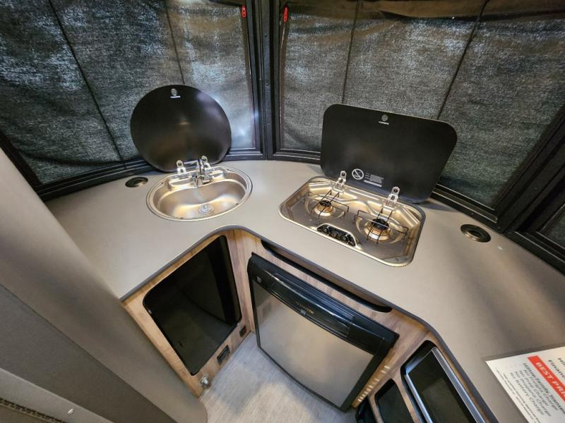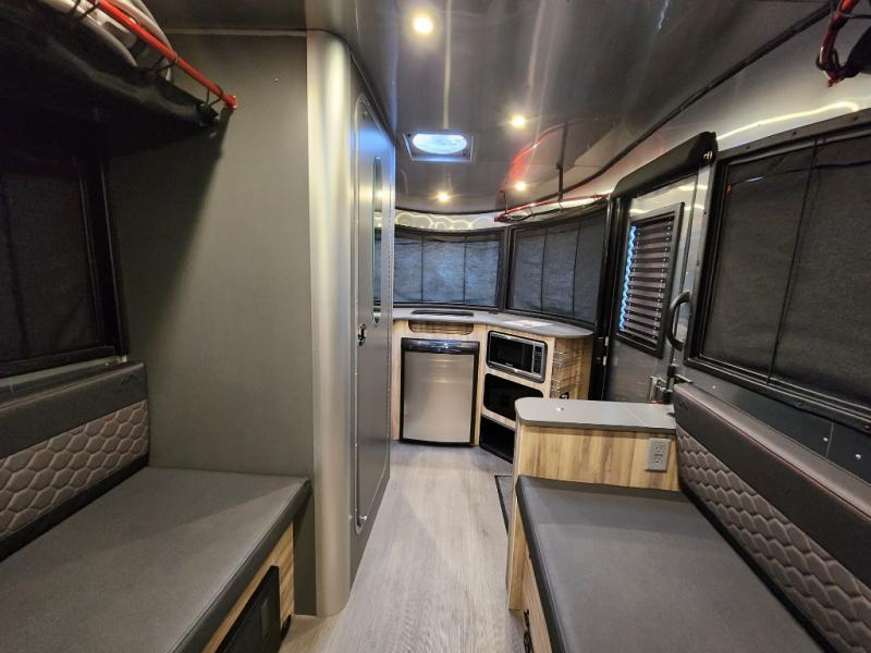 If you are seeking adventure with less hassle this Basecamp Std. Model travel trailer might just fit your fun lifestyle. It's easy to hitch up and provides plenty of comforts of home for off-road and off-grid adventures. The front kitchen allows you to store perishables in the refrigerator and make meals on the two-burner cooktop. Just imagine relaxing on the bench seats with a pedestal table in between while your storage is under your seat. You can configure the sleeping arrangements into one full bed or two smaller beds whichever you prefer. The on-board wet bath comes in handy during the nighttime and daytime, and the retractable clothes line allows you to hang a wet towel or two. Check this model out!