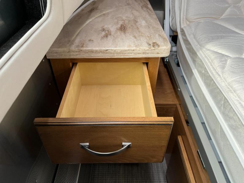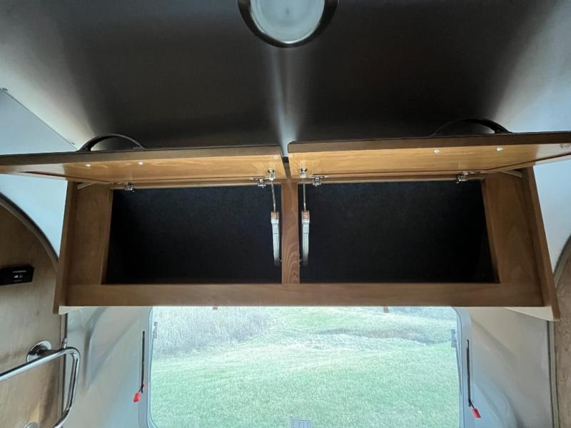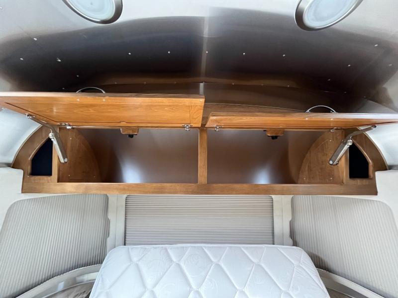At the rear of the Airstream, the private bedroom offers a cozy, peaceful space for rest after a long day of adventure. Ample wardrobe and drawer space help keep your clothing and personal items neatly organized throughout your journey.