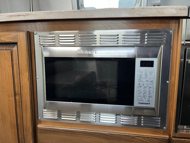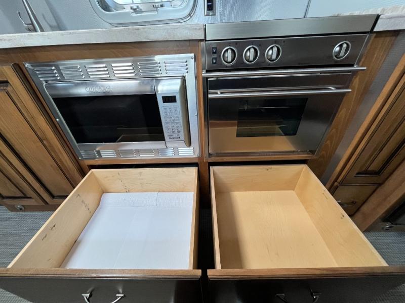 Cooktop, oven, microwave, and refrigerator make meals on the road simple and enjoyable.