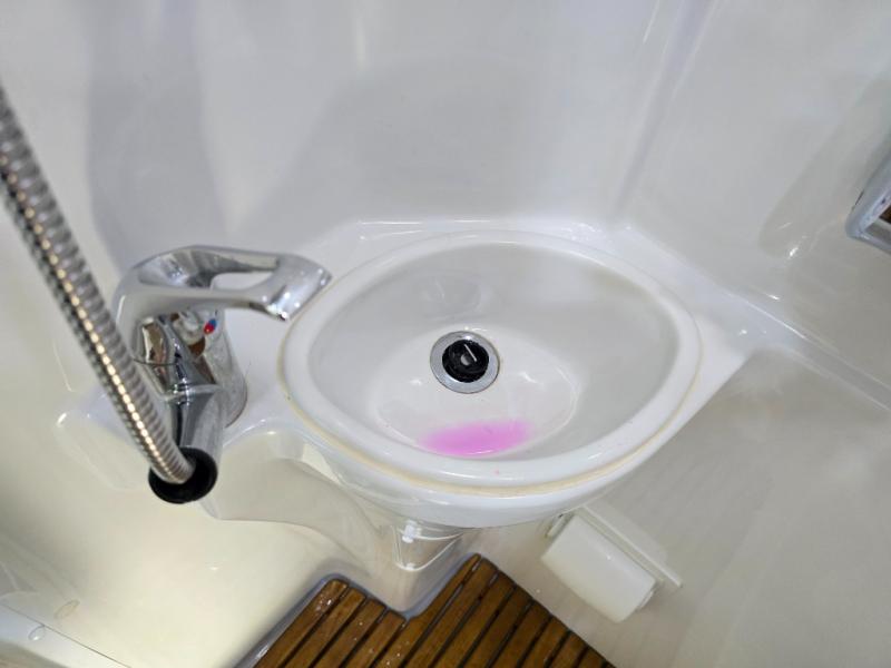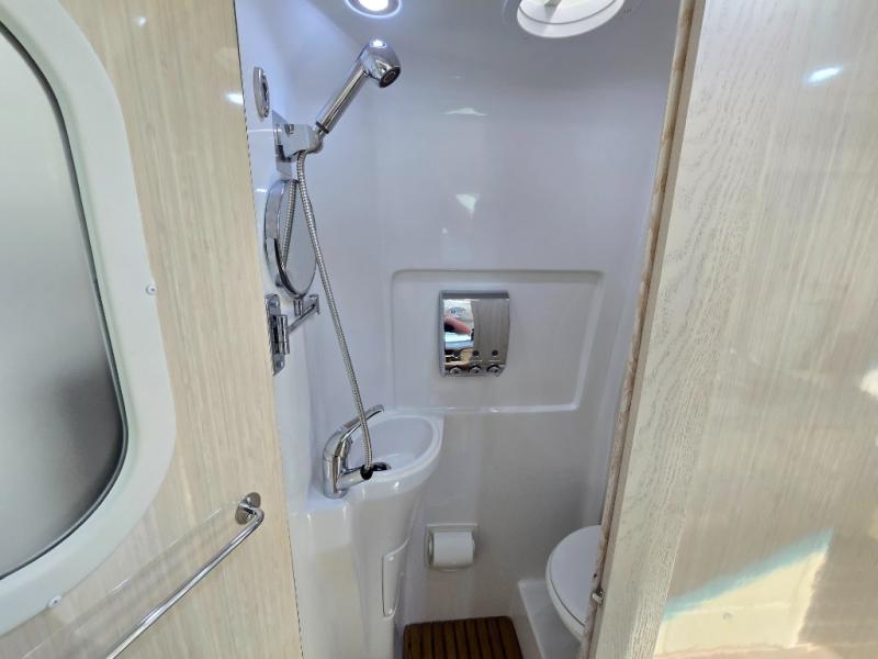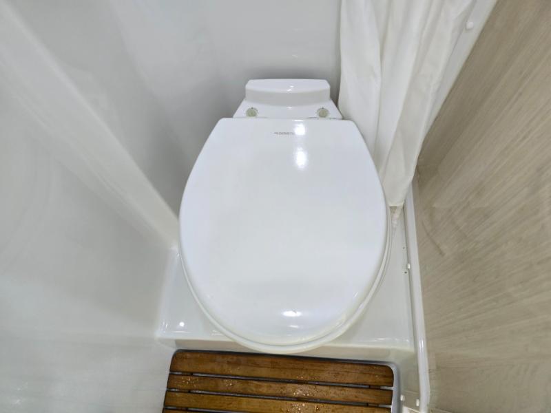 As you move toward the rear notice a convenient wet bath on your right which includes a toilet, small sink, and shower.