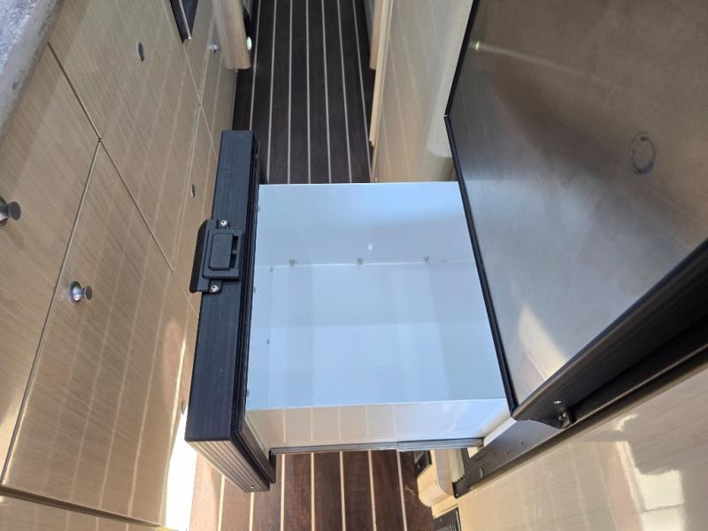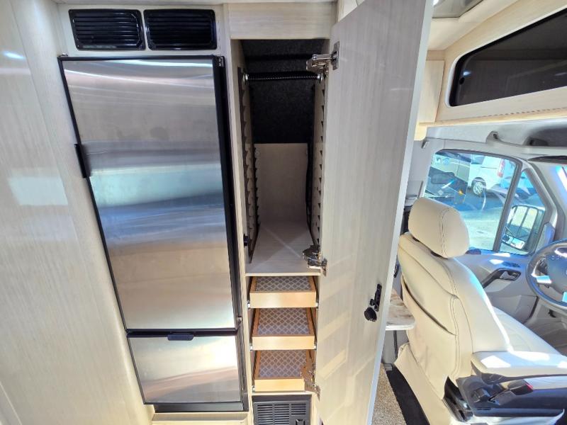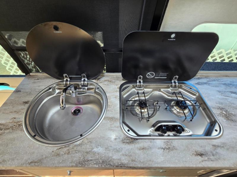 The galley has a sink, two burner range, and flip-up shelf along one side. The opposite side offers a large pantry/wardrobe and a refrigerator with freezer.