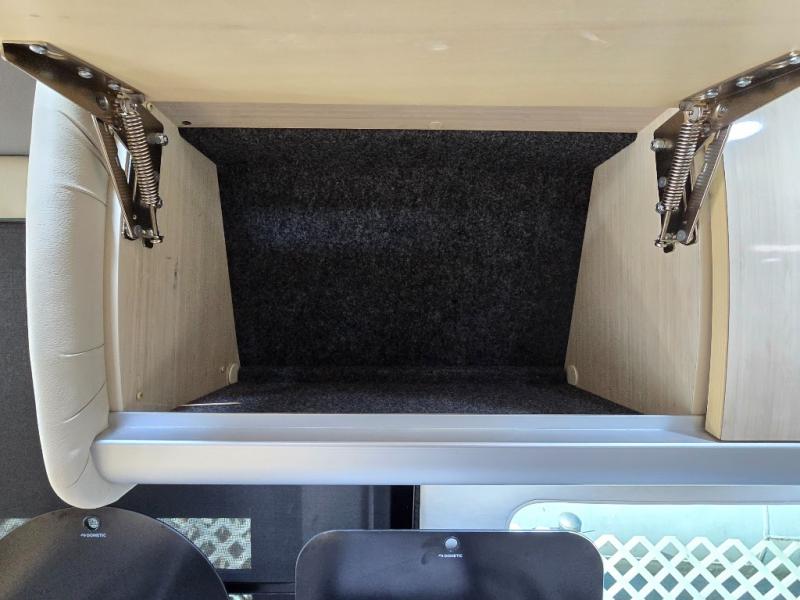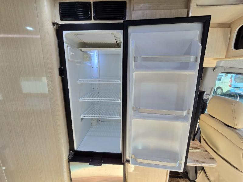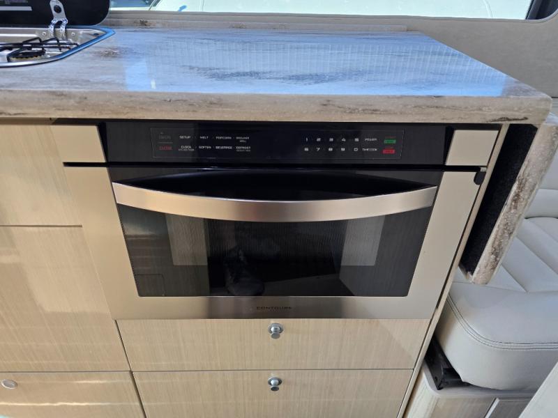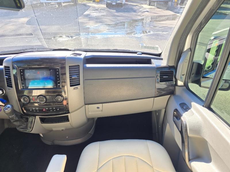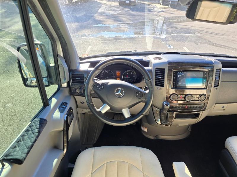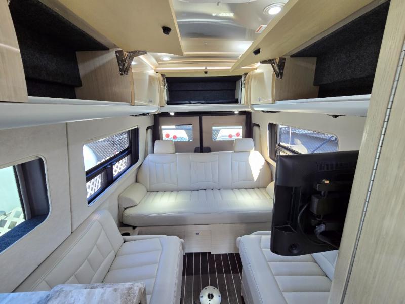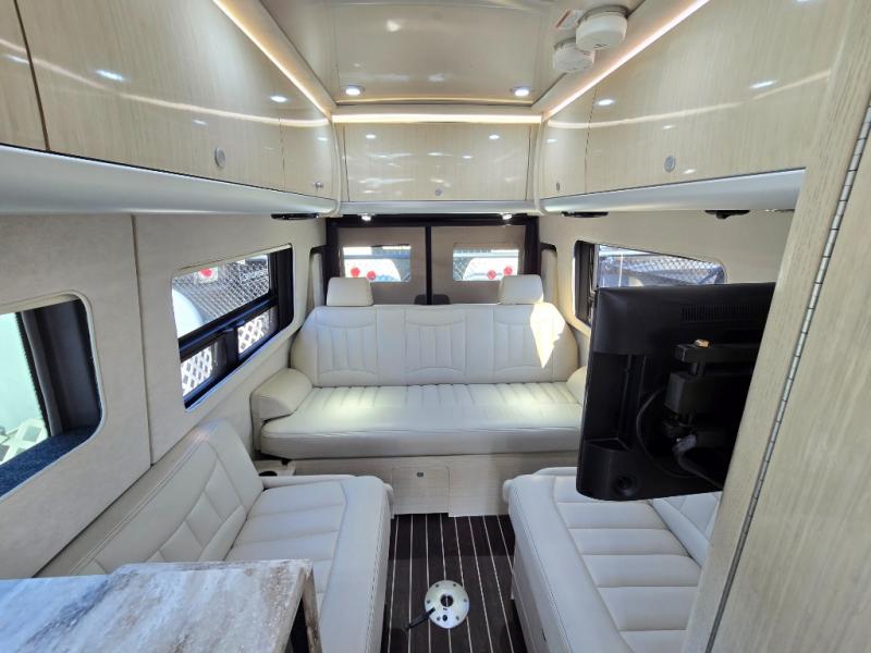 Step inside and find a convenient conversation area with the driver and passenger seats swiveled around. There is a removable table between the driver and passenger seat which allows for ease while eating or easy ability to play a game. Behind the driver's seat there is a work station and an LED TV.
