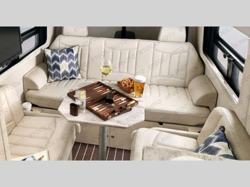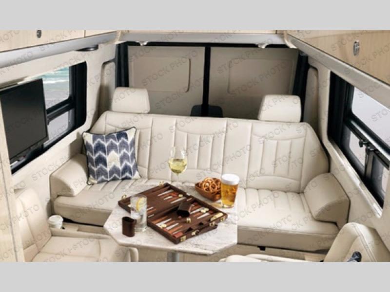 Step inside and find a convenient conversation area with the driver and passenger seats swiveled around and two additional lounge chairs, all with seat belts for safety while traveling. There is a removable table where you can enjoy your meal, or morning coffee.