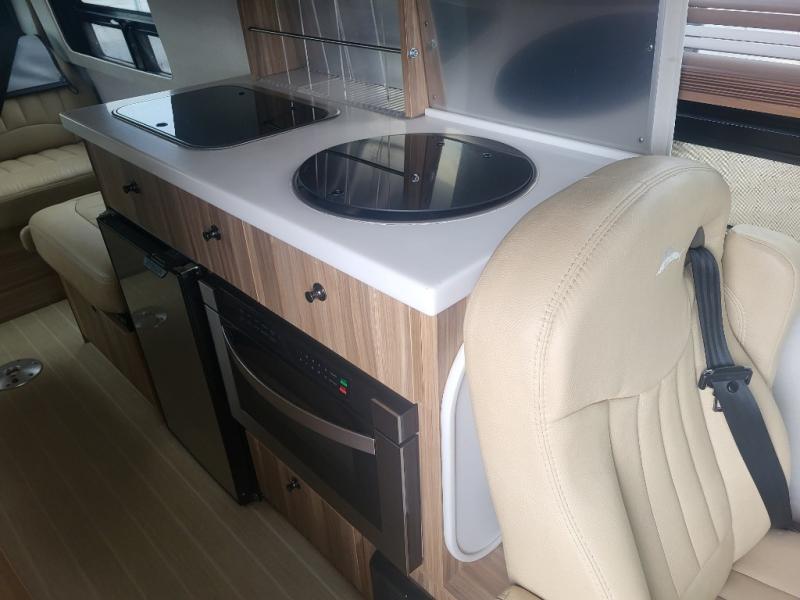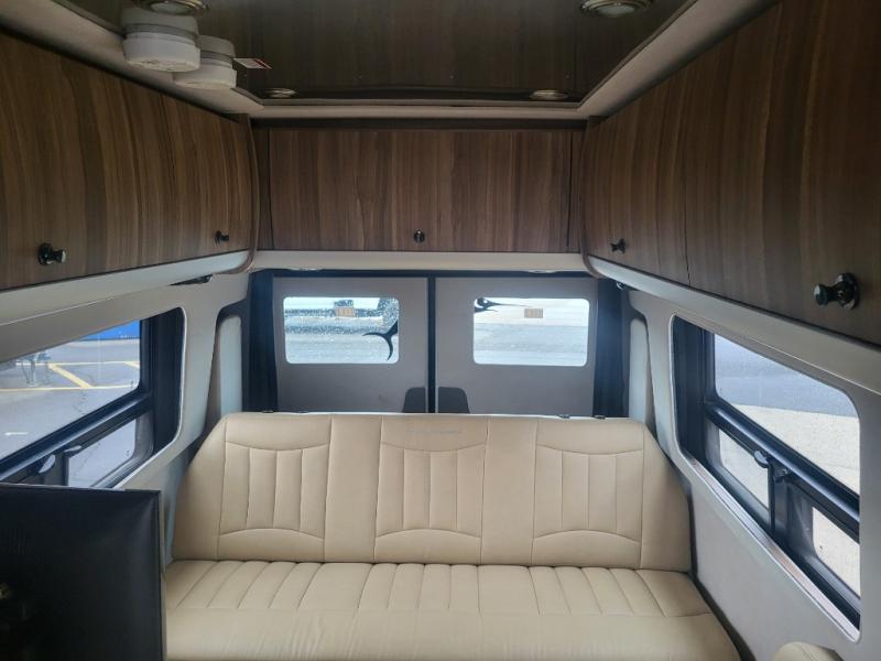 Step inside and find a convenient conversation area with the driver and passenger seats swiveled around and two additional lounge chairs, all with seat belts for safety while traveling. There is a removable table where you can enjoy your meal, or morning coffee.