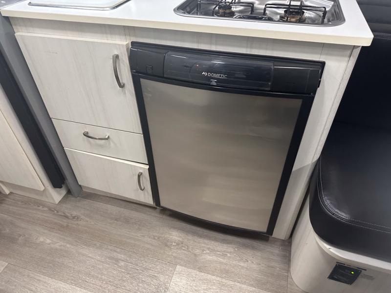 As you enter the travel trailer, to your right there is a dinette/bed for eating meals, playing games, or sleeping when made into a sleeping space.