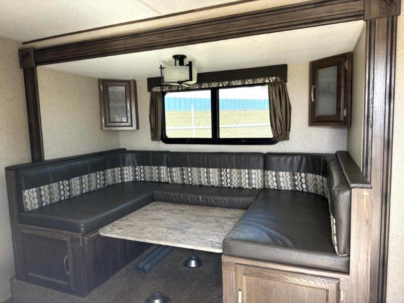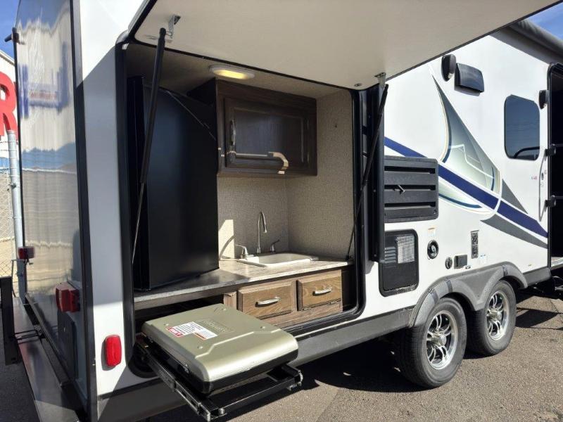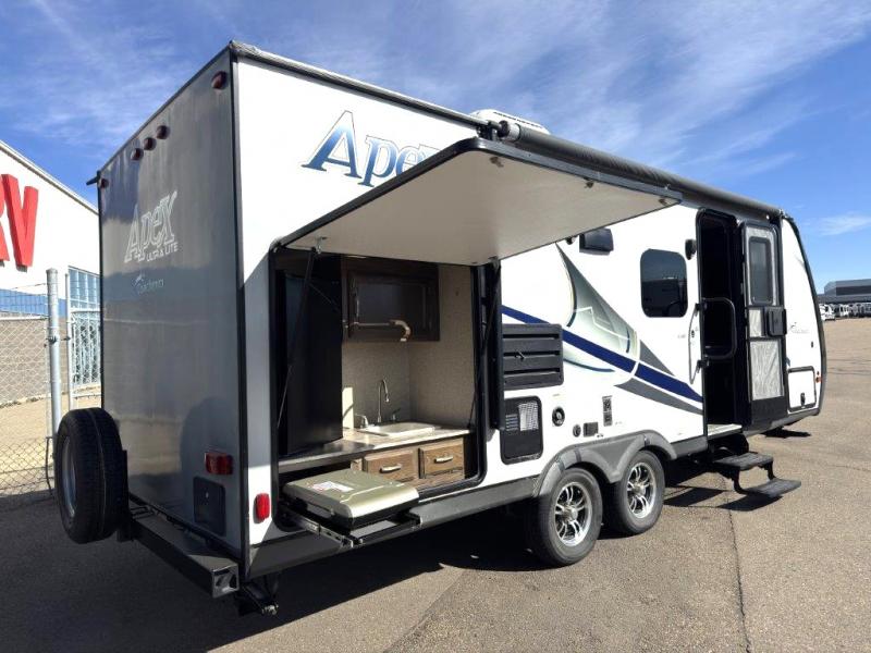Hitch up this Apex Ultra-Lite travel trailer and hit the road. Model 215RBK offers everything you need for inside enjoyment, and an outside kitchen. You will be able to relax on the queen bed with residential plush comforter, and unwind on the u-shaped convertible dinette. The rear bath offers a neo-angled shower with glass door that you are sure to appreciate after a fun day exploring outdoors. You will find many more features in this model you will want!