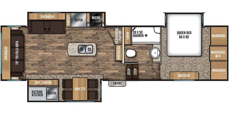 STAND OUT EXTERIOR FEATURES • TURN TEC™ ENGINEERING - #1 IN TURNING (SHORT BED FRIENDLY) • VACUUM BONDED GEL COAT EXTERIOR W/ COMPOSITE BACKED AZDEL® IN SIDEWALL PANEL • 80% PRIVACYTINT SAFETY GLASS WINDOWS • UV & CORROSION RESISTANTTPO ROOF W/ 12YEAR WARRANTY • SOLAR PANEL PREP • LP QUICK CONNECT PORT • EXTERIOR BACK-UP CAMERA PREP • ELECTRIC AWNING W/ LED LIGHT STRIP & ONE HAND PITCH ADJUSTMENT • EXTERIOR MARINE SPEAKERS W/ LED LIGHT • ALUMINUM ENTRYSTEPS • FRONT ELECTRIC JACKS • ELECTRIC REAR STABILIZER JACKS • ACCESSORYRECEIVER PREP • 15” RADIALTIRES W/ ALUMINUM WHEELS & SPARE TIR