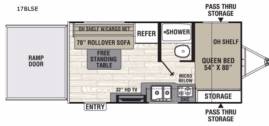 Stop imagining how much fun you will have with your off-road toys, and load up this Freedom Express Blast 17BLSE toy hauler travel trailer to hit the dunes. Once at your destination, you can easily set up the inside before taking off with your toys. The rollover sofa and free standing indoor/outdoor table allows you to dine and chill out while watching the 32" HDTV. You can get cleaned up in the private shower and toilet room before falling asleep on the queen bed. You will find plenty of storage for your gear on the shelves, inside the cabinets, and outside in the pass-through compartment. You can even make meals if you like. Step inside, and start imagining where all you will take this toy hauler.